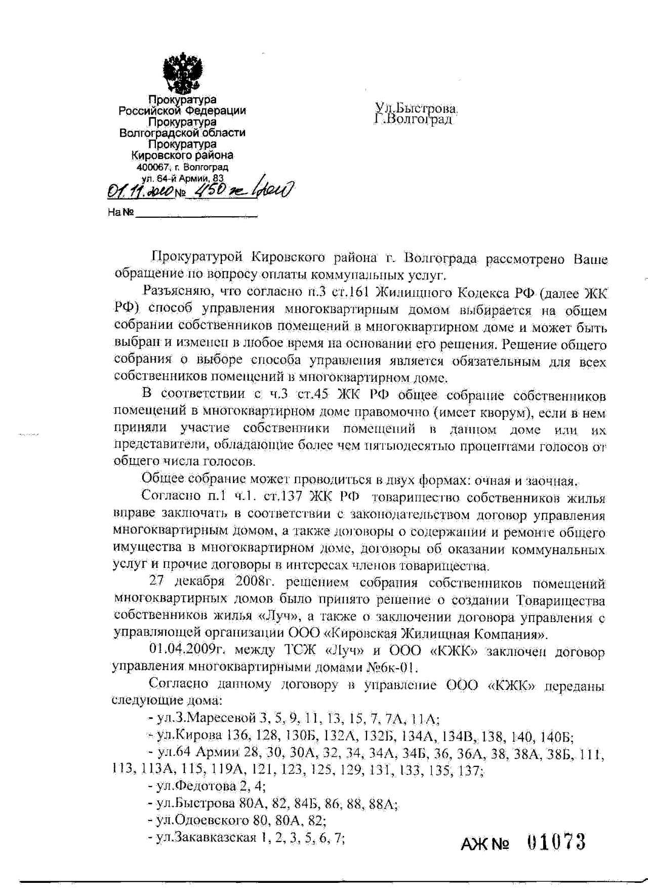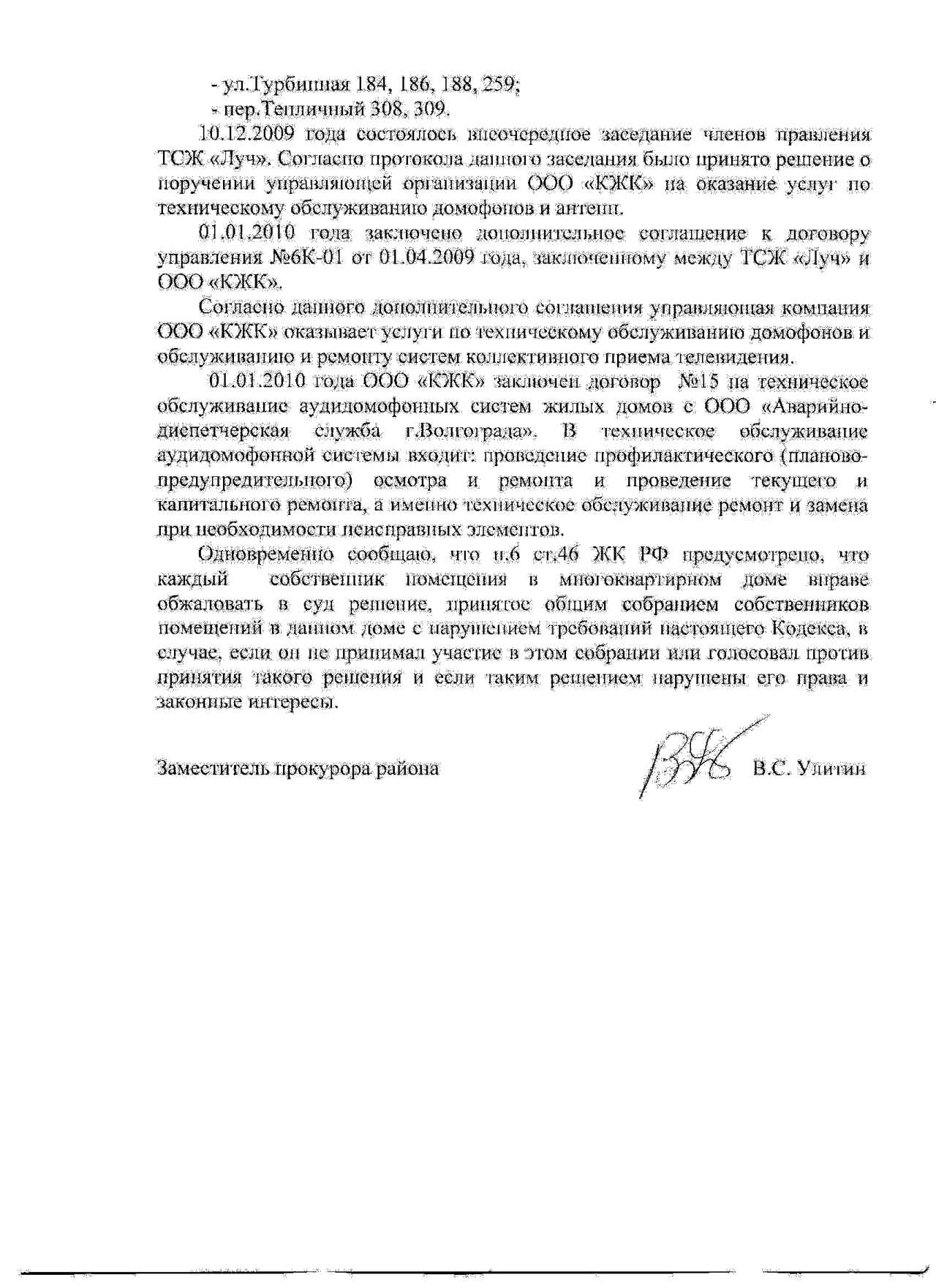 Жильцы нашего подъезда давно (лет 5 назад) самостоятельно поставили входную дверь и домофон. И, соответственно, платили за тех.обслуживание ежемесячно. И вдруг, с января 2010 г. новоявленная УК (упр.компания) решила сама стричь бабки за тех.обслуживание домофона. И с тех пор нам присылают впридачу к квитанции с домофонной фирмы, еще и строчку "Т.О. домофона" в платежке за услуги ЖКХ (от УК). Разумеется, я не стал платить за строчку в платежке, а попытался объяснить товарищам из УК их неправоту. Устно - не подействовало. Написал пиьсмо (как рекомендовал один товарищ из Отдела по защите прав потребителей в бесплатной газете) - так же не подействовало (написали в ответ какой-то бред). Затем написал в прокуратуру г. Волгограда. Сегодня пришел ответ от районной прокуратуры. Не нужно быть гением, чтобы догадаться о содержании прокурорского ответа. Даже не сомневался, что они встанут на сторону УК, написав мне, что, типа, они (УК) имеют право и если Вам (жильцам) не нравится - валите в суд. Вот я и думаю - куда валить?