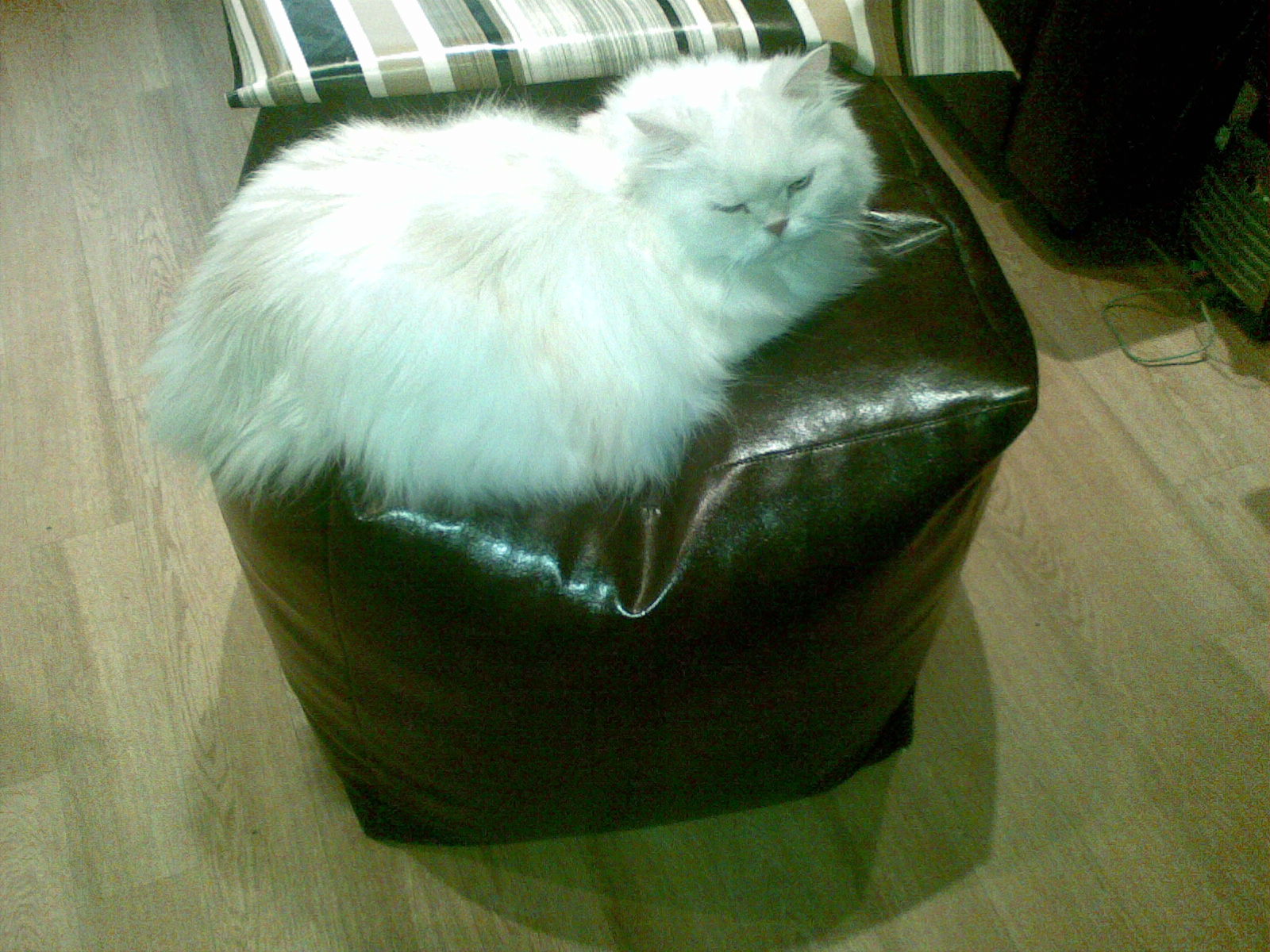Мы недавно заказали себе кожаный пуф, под обивку дивана из раздела бескаркасной мебели, внутри шарики, как у кресла груши. Пуф привезли, поставили в зале, думали будем за ним кушать, тк невысокий и за журнальным столиком сидеть удобно, а нефига подобного, кот в первый же день облюбовал себе лежаночку новую, мне на нем удалось посидеть от силы пару раз