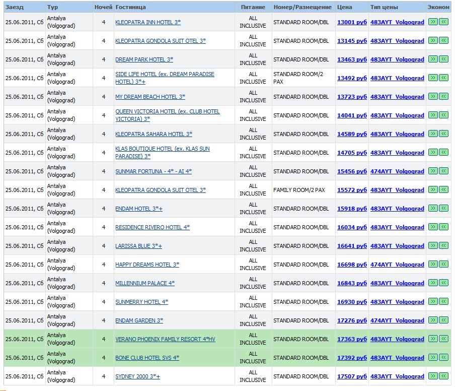 25 июня 2011 у Корала чуточку дешевле даже при том, что ночей 4... 3* от 12300; 4* от 13000; 5* от 16500