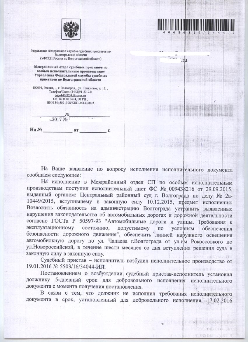 Сегодня пришел ответ из прокуратуры Волгограда. В нем говорится, что направлено исковое заявление в суд к администрации Волгограда