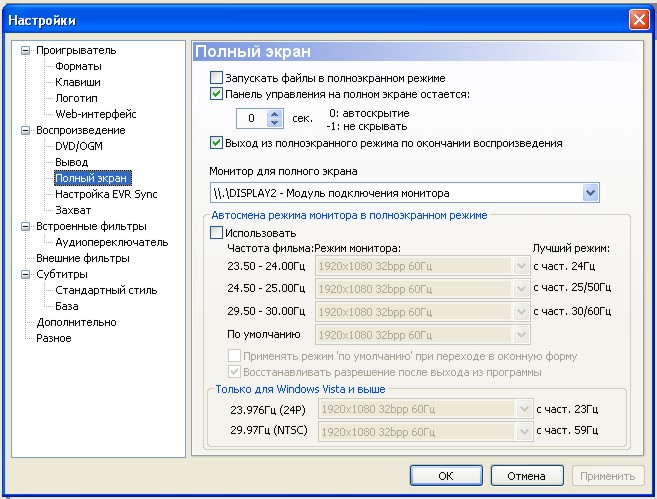 Может не совсем в тему, но сам пользуюсь: The KMPlayer (производное от Kang Multimedia Player) — проигрыватель звуковых и видео файлов для Microsoft Windows. Поддерживает практически все существующие мультимедийные форматы, среди которых VCD, DVD, AVI, MKV, Ogg, OGM, 3GP, MPEG-1/2/4, WMV, RealMedia, FLV и QuickTime. Главные особенности — громадное количество встроенных (по некоторым данным — иногда с нарушением условий свободных лицензий)[2][3] кодеков и гибкость настроек. Смотрится, проигрывается все что угодно и без всяких настроек и заморочек. (На видюхе HDMI, просмотр на 60 Гц )