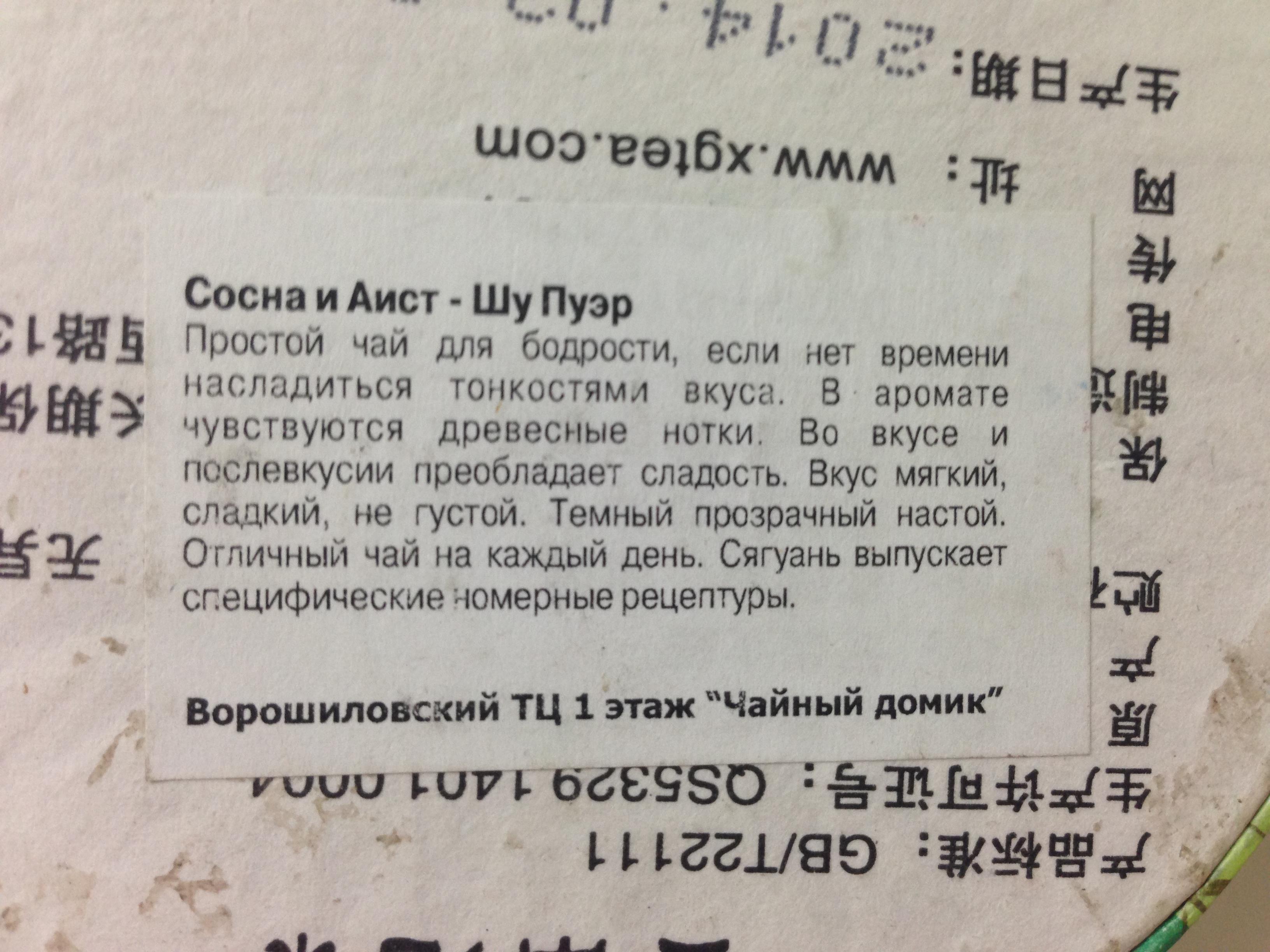 Маришка, ироглифы не разберу. Но в такой фасовке, она называется "мини точа" как правило пуэр низкого качества. Нужно покупать средние или большие блины. И пуэр как коньяк чем больше возраст, тем лучше.