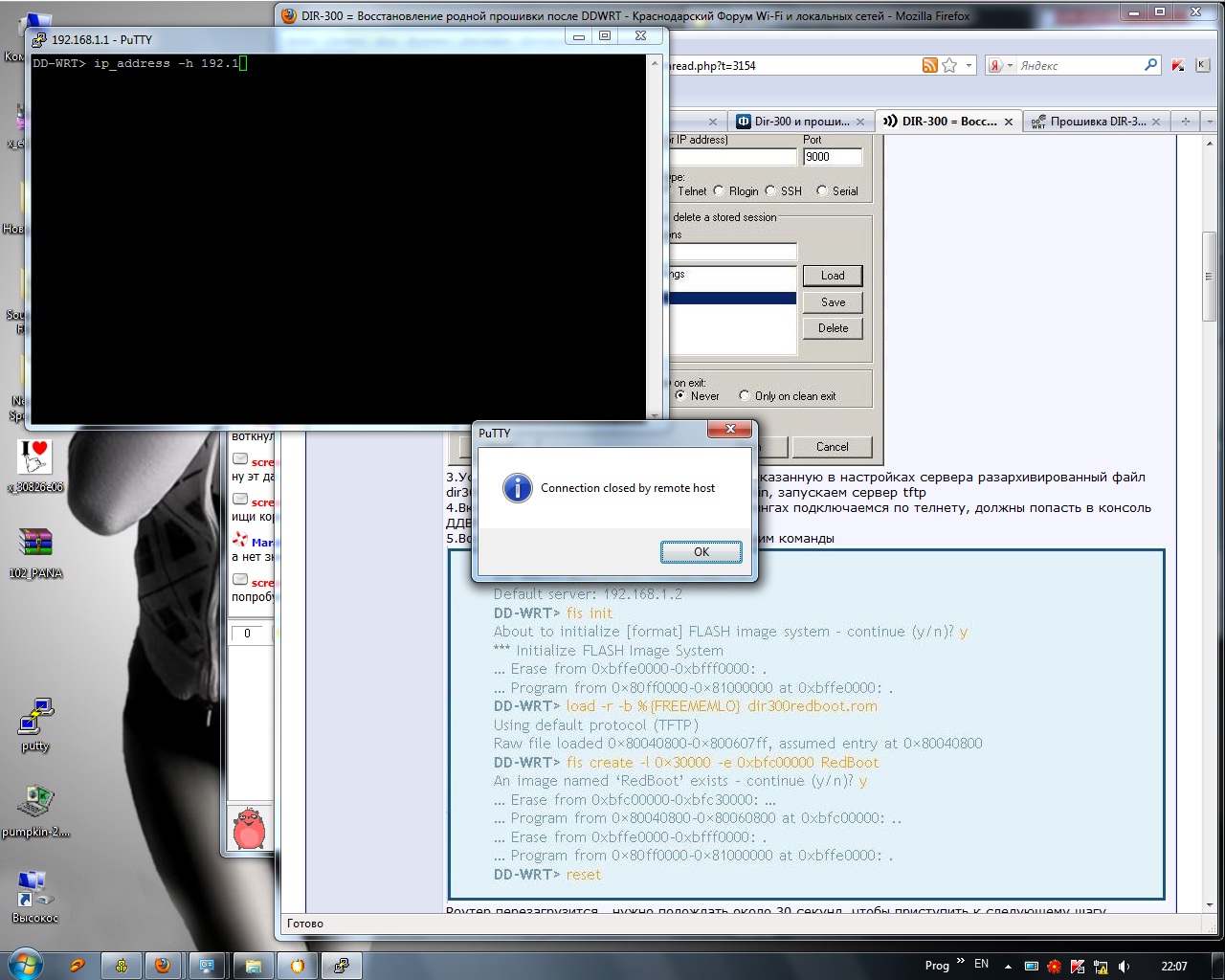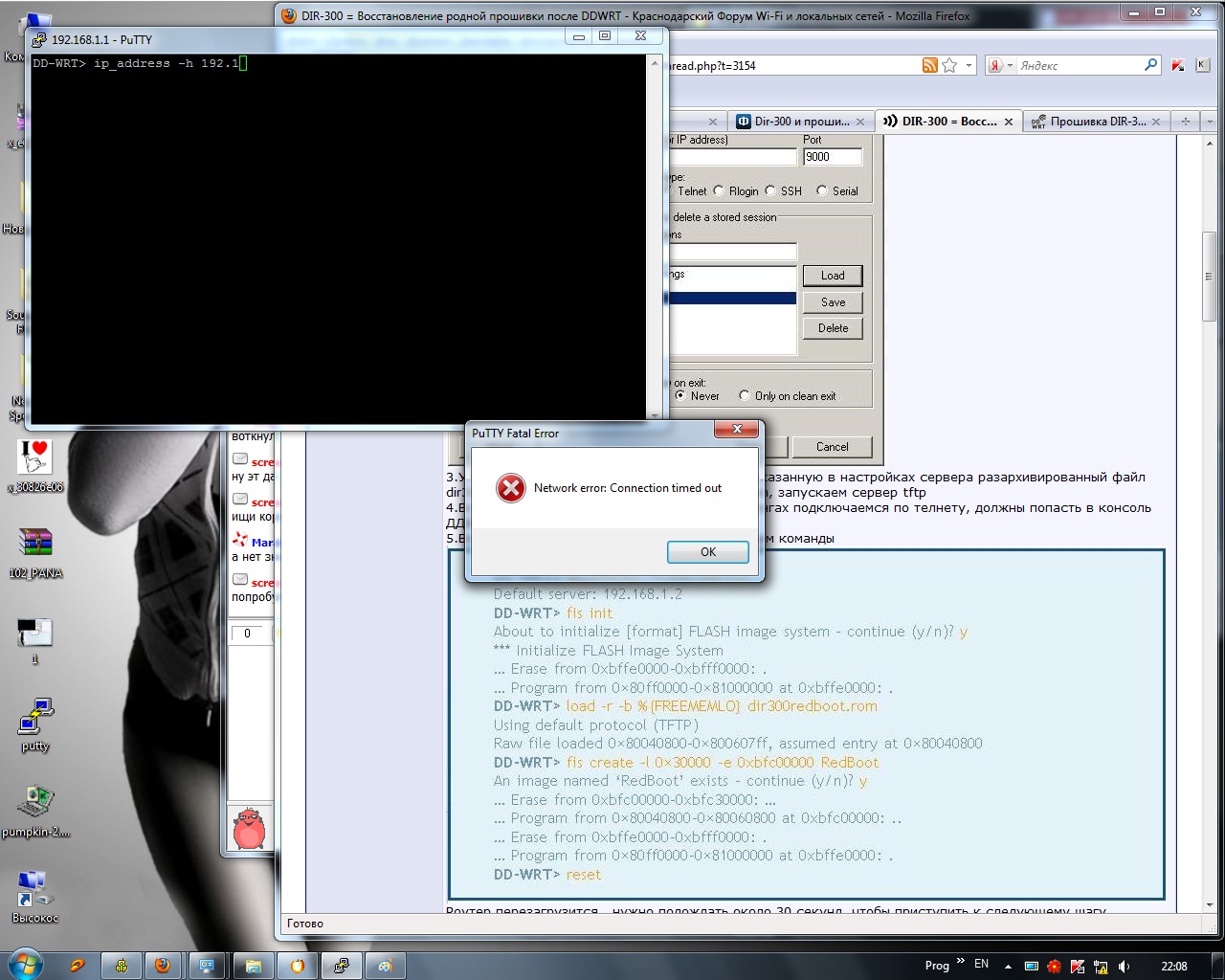 Почитай еще вот это http://www.dd-wrt.com/wiki/index.php/Прошивка_DIR-300 для соединения пользовался батниками указанными в конце статьи. Пробуй экспериментировать по этим инструкциям. Для тебя главное войти в страницу аварийной загрузки. И еще если прошивка пройдет, роутер оживет минут через десять (начнут мигать лампочки). до этого лежал полным трупом, а после ожил.