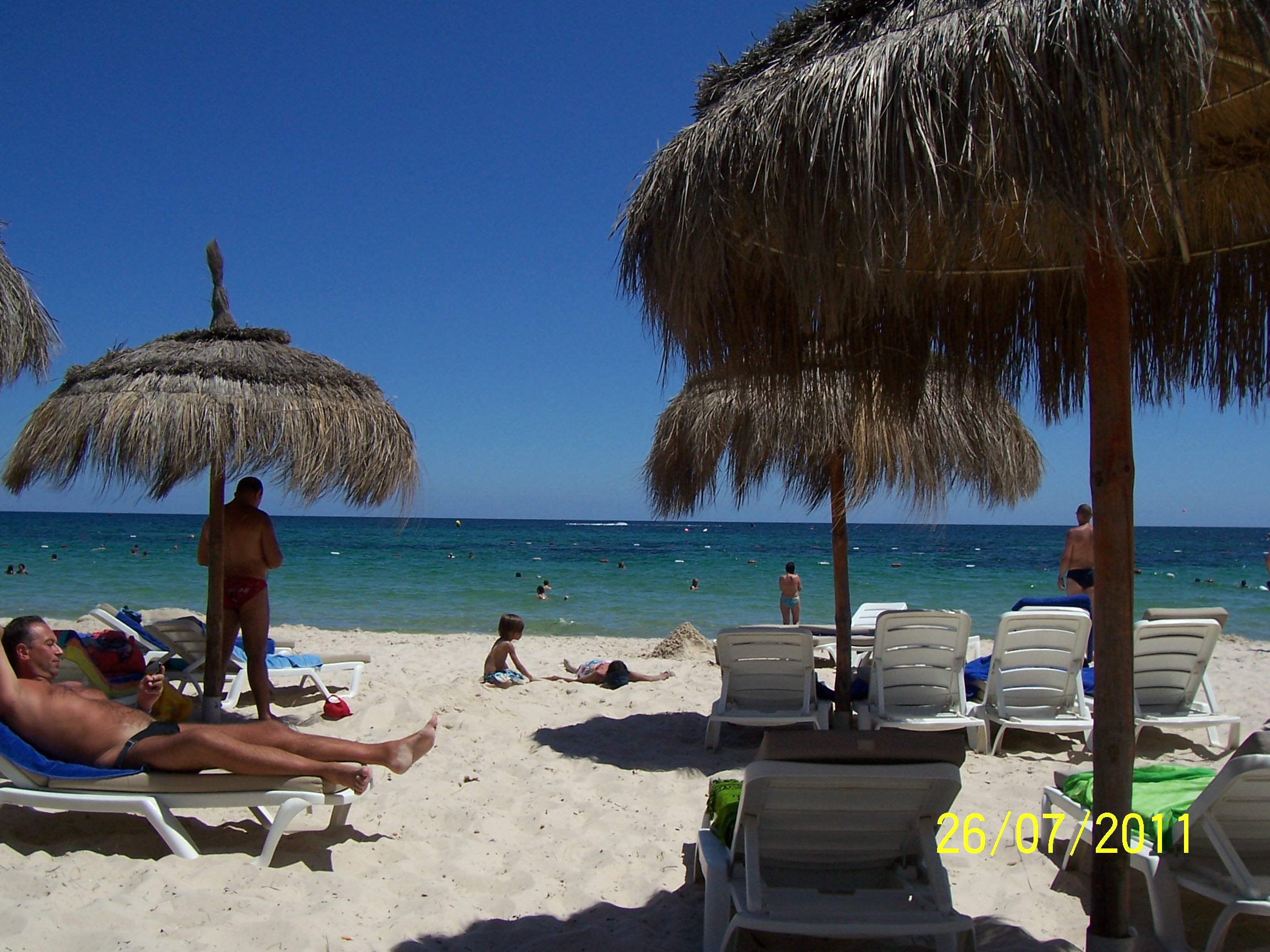 Ездили через оператора Пегас из Волгограда. В Волгоградском аэропорту всё как обычно: бешеные очереди на таможне, духота, толкотня и прикольный дедок на «ренгене». С собою можно провозить по 1 литру спиртного на человека, но на это как мне показалось, никто внимания не обращает, поэтому можно и больше кому надо. Волгоградский дюти-фри – ларек 3х3 метра. Летает Пегас в Тунис с Оренбургскими авиалиниями самолетами Боинг 737. Самолеты относительно добротные, чистые, кормят хорошо, управляют ими прекрасно, в зоны турбулентности практически не попадали. Летели туда 4 с половиной, обратно 4 и 10 минут. В самолете, хотя и запрещено пить, но никто существенно не ограничивает – если вести себя культурно. При полете в Тунис был инцидент с одним из пассажиров, который покурил в туалете и экипаж долго ему объяснил, что этого делать не стоит и может привести к катастрофе и т.д. и т.п. Аэропорт, города Монастир кажись, первое впечатление производит не особое – всего пара небольших самолетов, как будто туда никто не прилетает. По прилету необходимо заполнить въездную карту, которая в том числе имеет расшифровку на русском языке, поэтому труда не составит, никто на этом не «наваривается» как в Египте, единственное надо иметь с собою ручки. Карта состоит из 2 частей, первую отрывают на таможне при въезде по второй мы выезжали. Далее проходите таможню, достаточно быстро проверяют заполненную карту, ставят печати и вы свободны. Страна безвизовая для российских граждан, поэтому ничего платить за въезд не нужно. По прилету тоже есть дюти-фри, имеющее такой же жалкий вид как и в Волгограде. Выходя из аэропорта складывается впечатление, что попал на автовокзал какого-нибудь Урюпинска: в 30 метрах идет автодорога, людей нет, на парковке стояло несколько автобусов Пегаса и несколько их же гидов. Все разъехались, а мы были вынуждены ждать свой автобус минут 15. До отеля довезли минут за 40. Сам отель видно, что не новый, но за техническим состоянием следят постоянно и поддерживают его относительно хорошо для такого возраста. На ресепшене заполняете как обычно карту гостя. Для того чтобы нас нормально заселили, а нас было 5 (2 и 3 соответственно) дали 30 долларов. Деньги берут без проблем, могут сказать что мало, но не фига баловать. Номера дали 186 (семейный с 4 кроватями) и 182, находившиеся друг от друга в 3 метрах. Учитывая, что у них там своя какая-то методика определения этажности это был 3 этаж из пяти. Номера выходили на внутреннюю территорию отеля с видом на бассейн. Сам отель имеет П-образную форму. Считается, что это хорошие номера, так как другие имеют вид на соседние отели, дорогу, хоз. постройки с соответствующими звуковыми оформлениями и возможно запахами. Стандартный номер имеет площадь около 25 метров, санузел раздельный, кондиционер настенный, сейф (бесплатный) с инструкцией на русском, балкон метра 4, старый ЭЛТ телевизор. В номер при заезде кладут фрукты: финики, апельсины (немного старенькие). В холодильнике минеральная вода (бесплатно), если нет то кладут новую при уборке, если не забудут конечно . Убираются каждый день, насколько часто меняют белье не обращал внимания. Постоянно оставляли по 1 динару (местная валюта) за уборку, убирались хорошо, да вроде и мы не свиньи особо и убирать нечего было, убирали у одних из первых. Однако, заметил, что в последние дни сменилась 