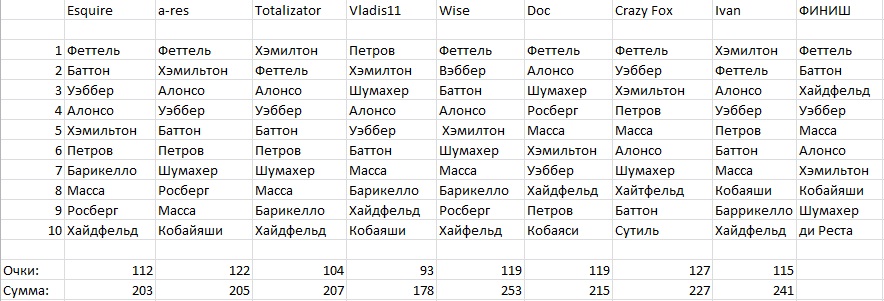 Поздравляю Esquire, угадал места 4 гонщиков. Esquire - 181 Wise - 180 Ivan - 177 Totalizator - 163 DEMAN_FON_LIS - 161 a-res - 150 Crazy Fox - 141 Vladis11 - 133 Doc - 126