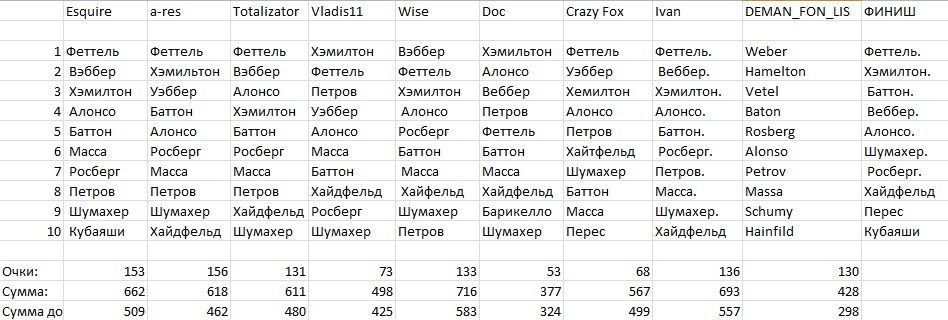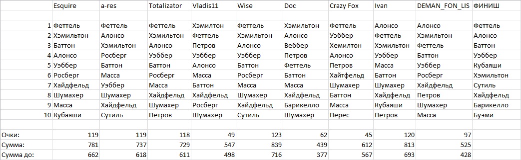 Esquire, я ток приехал с отпуска, ща накатаю. ---------- Сообщение добавлено 28.05.2011 23:02 ---------- 1. Хэмилтон 2. Феттель 3. Алонсо 4. Вэббер 5. Баттон 6. Масса 7. Шумахер 8. Петров 9. Хайдфельд 10. Кобаяши