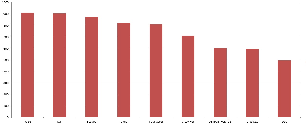 Результаты конкурса прогнозов: Crazy Fox - 98 Totalizator - 80 DEMAN_FON_LIS - 78 Wise - 71 Ivan - 90 a-res - 83 Esquire - 90 Vladis11 - 114 Doc - 105 Я и Vladis11 угадали по 2 места. Esquire, для "опоздунов" посчитай сам правильное количество очков.