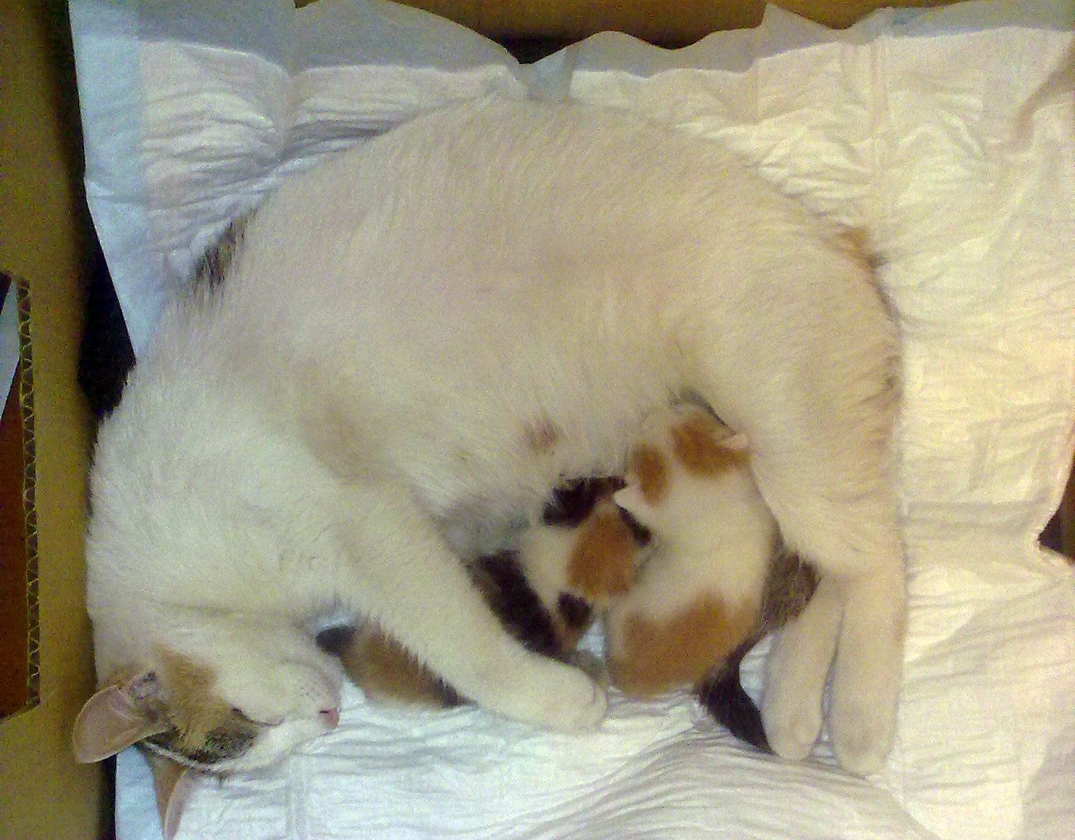 Кошечка, трехцветная, довольно спокойная. Пока братец не поднял писк, молчала в тряпочку в буквальном смысле. Я им пеленку менял.