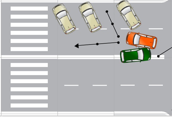 Хотелось бы услышать ваше мнение, кто виноват в данной ситуации? Ниже прилагаю примерную схему. Разметка немного другая, вместо двойной спошной, одна сплошная, да и полос движения меньше))). Рассматриваемая ситуация произошла между островками на пересечении Порт-Саида и пр. Ленина. Оранжевая машина отъехала задним ходом от места,где была припаркована, только начала движение вперед, буквально 1 секунда и произошел удар в заднее левое крыло. Зеленая машина таким макаром поворачивала на пр. Ленина.