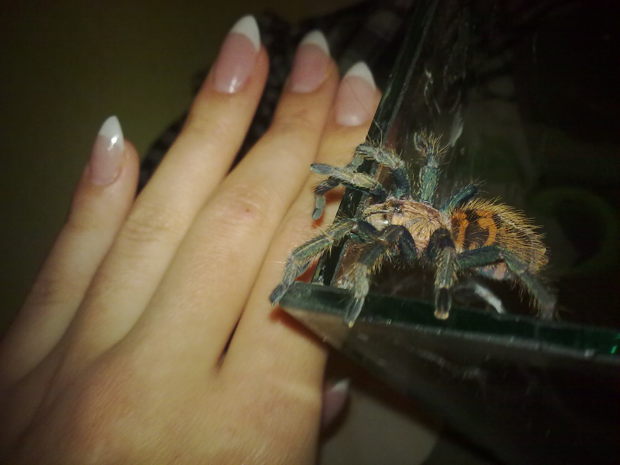 У меня два паука и куча тараканов A1R, не много вас поправлю. Продолжительность жизни зависит ещё и от вида. В среднем самцы живут 2-3 года, самочки значительно дольше. А вообще брать паучка лучше детёнком Так и дешевле и интересней Правда есть риск попасть на самца, Л1-Л5 редко продают определёнными ---------- Сообщение добавлено 07.05.2011 02:07 ---------- Вы не определяли пол? Я так поняла у тебя Brachypelma Boehmei, вид достаточно спокойный. Кусается крайне редко, да и не шибко ядовит, если нет аллергии можно попробовать ---------- Сообщение добавлено 07.05.2011 02:12 ---------- это Brachypelma auratum, ну это так. А вообще красота. Можно попробовать и потомство получить
