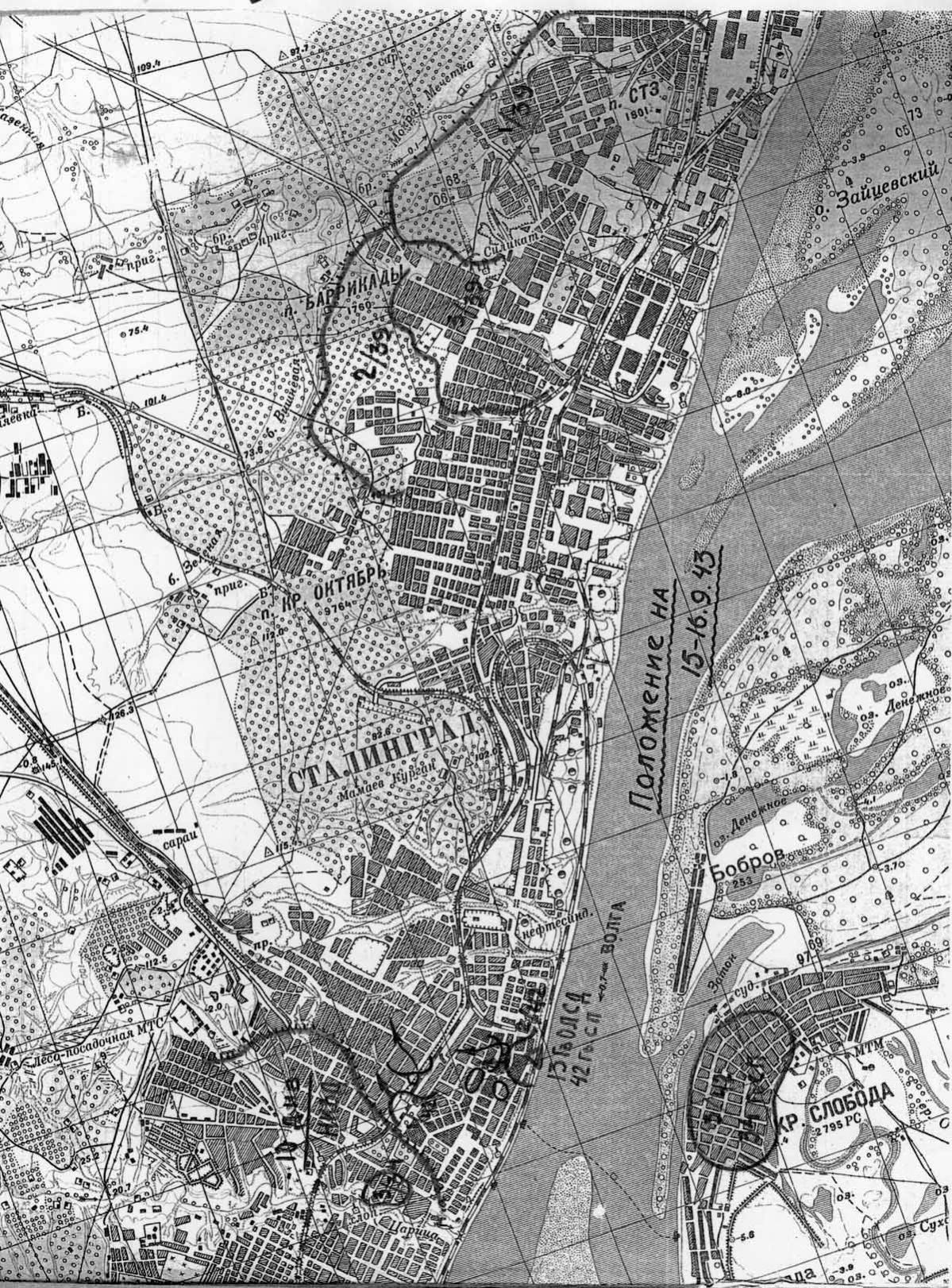 Местность "Дворца спорта" и Научного городка, а не элеватор. Левее вниз Мамаев Курган. Левое полукольцо ракетки осталось и поныне.