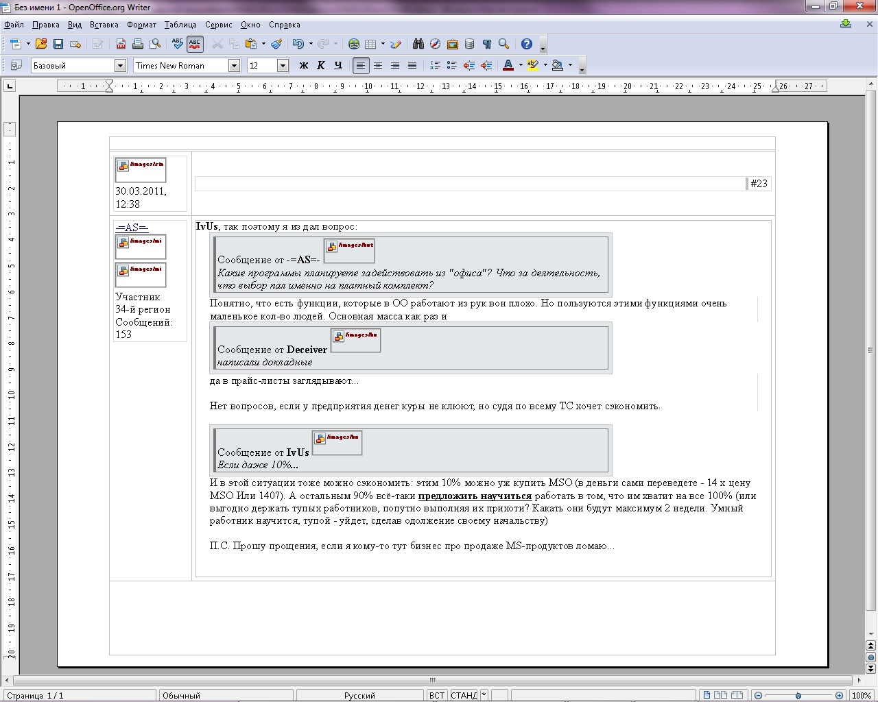 а мне почему-то не страшно - не знаете почему? Хотя всё делаю без проблем. Может дело в том, что просто нет желания? ТАК ЕЩЕ ПРИМЕРЫ БУДУТ, кроме копирования текста из интернета? Это зачем? Мазохизм? Для просмотра есть бесплатный вьювер. Документы внутри организации делаются одинаковыми программами - Вы же фотошопом не редактируете текстовые документы? Документы для клиентов обычно даются без возможности их изменять (набранный в ОО документ за очень редкими случаями, прекрасно сохраняется в формате doc, ну а если уж не сохраняется, то его без проблем можно перевести в формат pdf - это вот как раз мой случай, т.к. очень сложный прайс-лист, в котором на разных листах разные стили и таблицы (одна, две и три вертикальных на разных листах в одном файле) и разные колонтитулы. Ну а про вообще редкие случаи я уже сказал. Просто мне никогда не понять, зачем покупать MSO на те ПК, за которыми сидят люди, считающие себя продвинутыми пользователями, но: - делающие красную строку пробелом - вообще не знающие, как выравнять документ по краям - использующие только тот шрифт, который по умолчанию - набирающие таблицы в том виде, который вышел по умолчанию - от слов "колонтитул", "раздел" и "гиперссылка" впадающие в кому. А таких полно. И именно такие чаще всего и кричат, что им нужна только последняя версия MSO, а в других программах они работать не могут. Надоело если честно, что и кому мы тут пытаемся доказать? Платите MS и компания - платите. Кто захочет сэкономить - сэкономит. Среди наших поставщиков есть питерская фирма, которая снабжает опр. продукцией всю страну, там сотрудников уж не меньше 200 однозначно - спокойно работает в OO уже несколько лет подряд и не жалуется. ---------- Сообщение добавлено 31.03.2011 11:43 ---------- Ну ворд тоже не идеально скопировал - похерил форматирование текста. Отсутствие картинок во втором документе говорит только о том, что что-то Вы не доделали (но что, я говорить не буду - оно Вам всё равно не нужно). Так и не могу понять для чего нужно такое .... обычное копирование... И многие ли в работе этим занимаются? А судя по скринам, Вы толком в программе им не разбирались - все иконки стоят по умолчанию. Любой человек, который не пытается искать недостатки, подгоняет программу под себя - удаляя лишнее, добавляя необходимое. Сравните Ваши панели и мои. P.S. на остальные выпады даже отвечать не хочется...