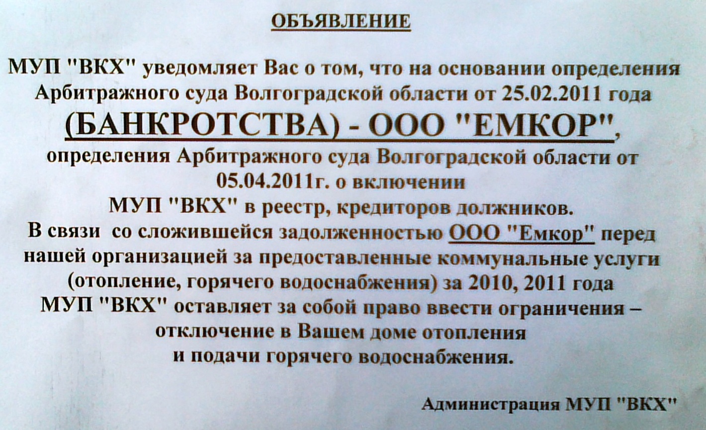 Емкор в почтовые ящики стал рассылать листовки, что их обклеветали т .д., что просто заговор против них. Это чтобы люди не стеснялись платить за коммуналку и побольше с их выжать? lange, На сайте Арбитражного суда написано, что начата процедура наблюдения http://www.volgograd.arbitr.ru/index.php?chapt=97&item=8587