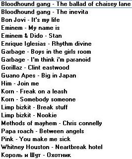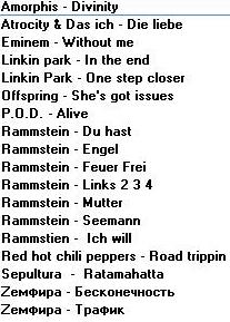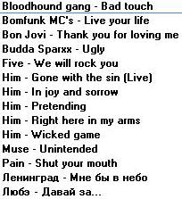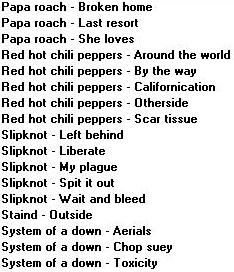 С Музлом пока только 5 дисков... там нового нет (почти). ДИСК I 1.Incubus Make yourslef Morning view 2.Methods of mayhem Methods of mayhem 3.Red hot chili peppers By the way 4.Zemfira Прости меня моя любовь 5.Ленинград Дачники Маде ин жопа Мат без электричества Пираты XXI века Пуля Пуля (Диск 1) Пуля (Диск 2) Тексты Ленинград ДИСК II 1.Bon Jovi Bounce 2.Guano apes Don't give me names Don't you your beck on me turn Тексты Guano apes Фото Guano apes 3.Papa roach Lovehatetragedy Тексты Papa roach Фото Papa roach 4.System of a down System of a down Toxicity Текст System of a down Фото System of a down 5.Vopli vidopliassova Fayno 6.Сергей Шнуров Второй Магаданский 7.Сплин 25 кадр Гранатовый альбом ДИСК III 1.Everlast Eat at whitey's 2.Goo goo dols Gutterflower 3.Machine head The burning red 4.Megaherz Herzwerk II 5.Molotov Donde jugaran las ninas 6.Rammstein Herzeleid Mutter Rammstein' text Разное 7.Tanzwut Tanzwut 8.Vidoedrone Vidoedrone ДИСК IV 1.Bomfunk mc's Burnin' sneakers 2.Das ich Anti'christ Das ich' photo Das ich' text Re laborat 3.Kramm Coeur 4.Zемфира Singles До свидания Земфира Земфира + Rammstein Трафик Фото Zемфира Четырнадцать недель тишины ДИСК V 1.Alien ant farm Alien ant farm 2.Nickelback Curb Silver side up 3.Sugar ray Lemonade & brownies 4.Король и Шут Акустический альбом Будь как дома, путник Герои и злодеи Ели мясо мужики Жаль, нет ружья Как в старой сказке Камнем по голове Король и шут Тексты Король и Шут Фотки Король и Шут 5.Танцы минус Флора-фауна