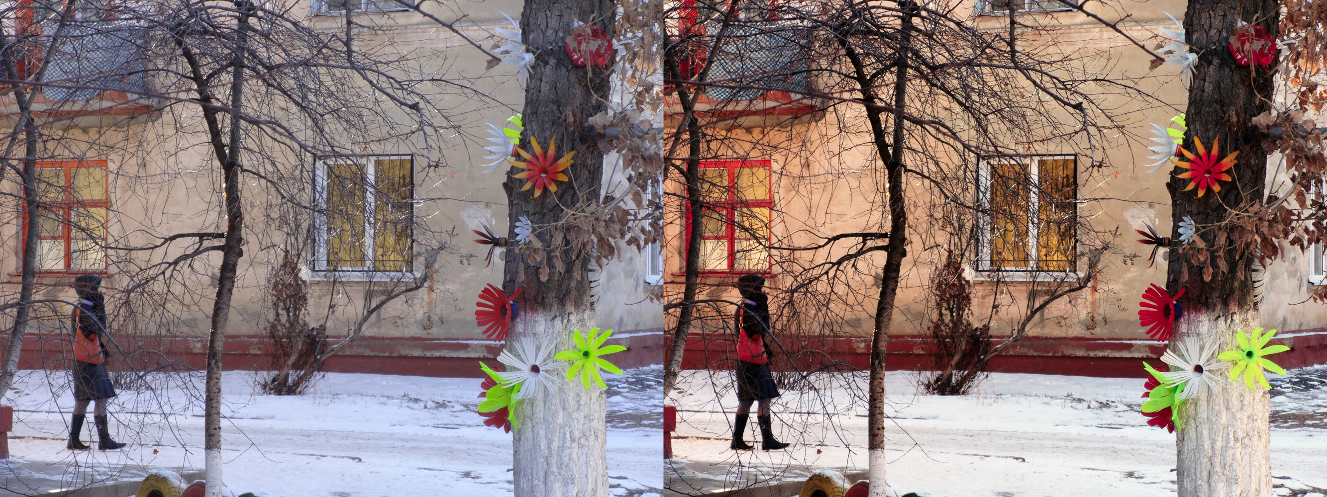 sblack, ну вот более или менее показательные "было-стало". Из камеры сонька выдаёт, как я уже говорил, снимки с невысокими контрастом, экспозицией и насыщенностью, так что их можно крутить в редакторе. Можно, конечно, и не крутить. Тем более, что на телевизорах и планшетах нынче яркость высокая, соответственно, контраст бешеный, оно и так при просмотре само собой "улучшается". Ещё есть режим Color Pop, который их накручивает в камере, но я не пользовался. По цветопередаче для себя я мыльницы разместил следующим образом: первое место делят сони, самсунг и панасоник, дальше - фудж, за ним - никон. Остальные камеры, включая любимый в народе кенан, в рейтинг не пробились Из всего этого зоопарка сони даёт наиболее ровную экспозицию и адекватную сюжету обработку. У остальных она сильнее пляшет от кадра к кадру. Резкость выше всех у сони и самсунга. Так что в конечном счёте выбор мегазума сводится к выбору модели сони серии WX или HX, потому что из сонек именно у них самый широкий угол, самый размашистый зум, самая высокая резкость и самый адекватный процессинг. В принципе, самсунги серии WB с матрицей КМОП тоже весьма неплохи, но у них, как мне показалось, сильнее экспозамер пляшет, чем у сонек. При этом однозначно интересным является Samsung WB350F из-за ШУ 23 мм. Панас вылетел из конкурса по причине стабильной переэкспозиции. Фудж - по причине хронического мыла по левому или правому краю кадра, уж как повезёт. Это связано с конструкцией оптики. А у никона цвет какой-то химический. В общем, Sony WX/HX или Samsung WB с КМОП (CMOS) матрицей. Тип матрицы смотреть, например, на яндекс-маркете. А соньки - все на кмопах, причём с обратной засветкой. Просто с ПЗС-а картинка более рваная, а с КМОП-а - более гладкая при таком интенсивном шумодавлении, которое требуется на столь крошечных пикселах. Но, конечно, зависит от алгоритма. У сони и самсунга обоих алгоритмы классные.