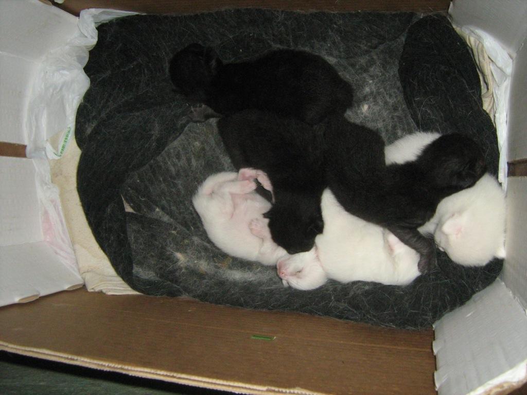 В подъезде кошка родила 6 котят: 3 белых, 3 черных. Они ещё не открыли глазки, но уже ищут дом (где-то через месяц, конечно) Мама у них очень красивая! Уборщица - добрая женщина, заботится о них пока