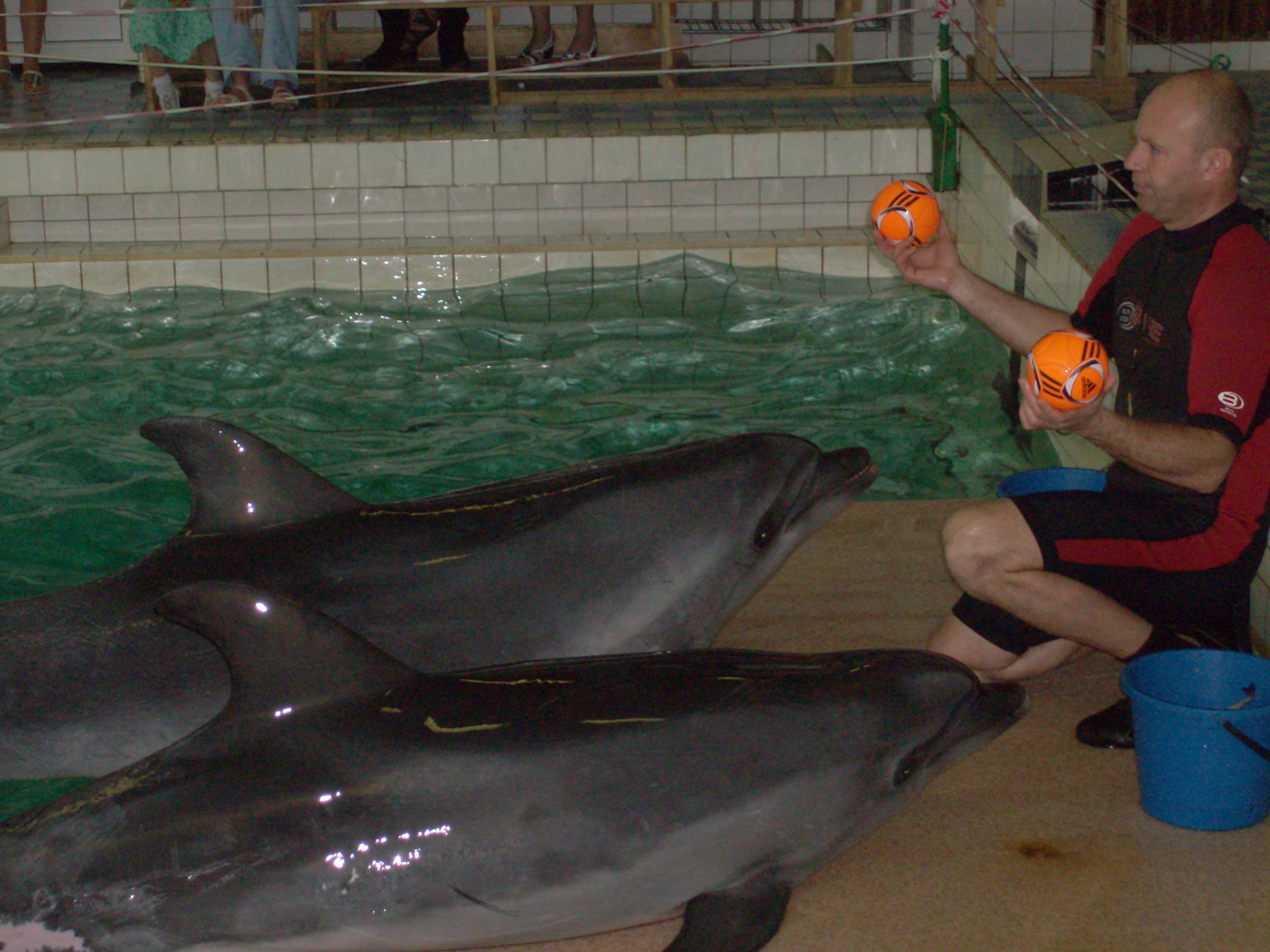 В Саратове все лето находится на гастролях анапский дельфинарий. Располагается в обычном крытом плавательном бассейне, наполненном морской водой. Вход на представление - 400р. Там 2 дельфина и один морской котик. Дрессура хорошая. Само шоу - УГ. Ничего особенного, но детям нравится сам факт созерцания дельфинов. Дети - 70% гостей. Длится шоу - около часа. Потом с дельфинами можно сфотографироваться и искупаться. Фото с дельфином - 200 р/кадр(своим фотиком), 300р - фотограф. Фотку выдают тут же, или сфоткают на твою SD. Купание -1000р. По времени 2-3 минуты. Сначала едешь на одном, потом на другом, потом на обоих. Всего три круга по бассейну. Ничего особенно делать не нужно. Дельфины сами подплывают, хватаешь за плавник - и они сразу едут. Если в момент купания ты хочешь, чтобы тебя фоткали (твои друзья твоим фотиком) + 200р/сколько хочешь кадров.