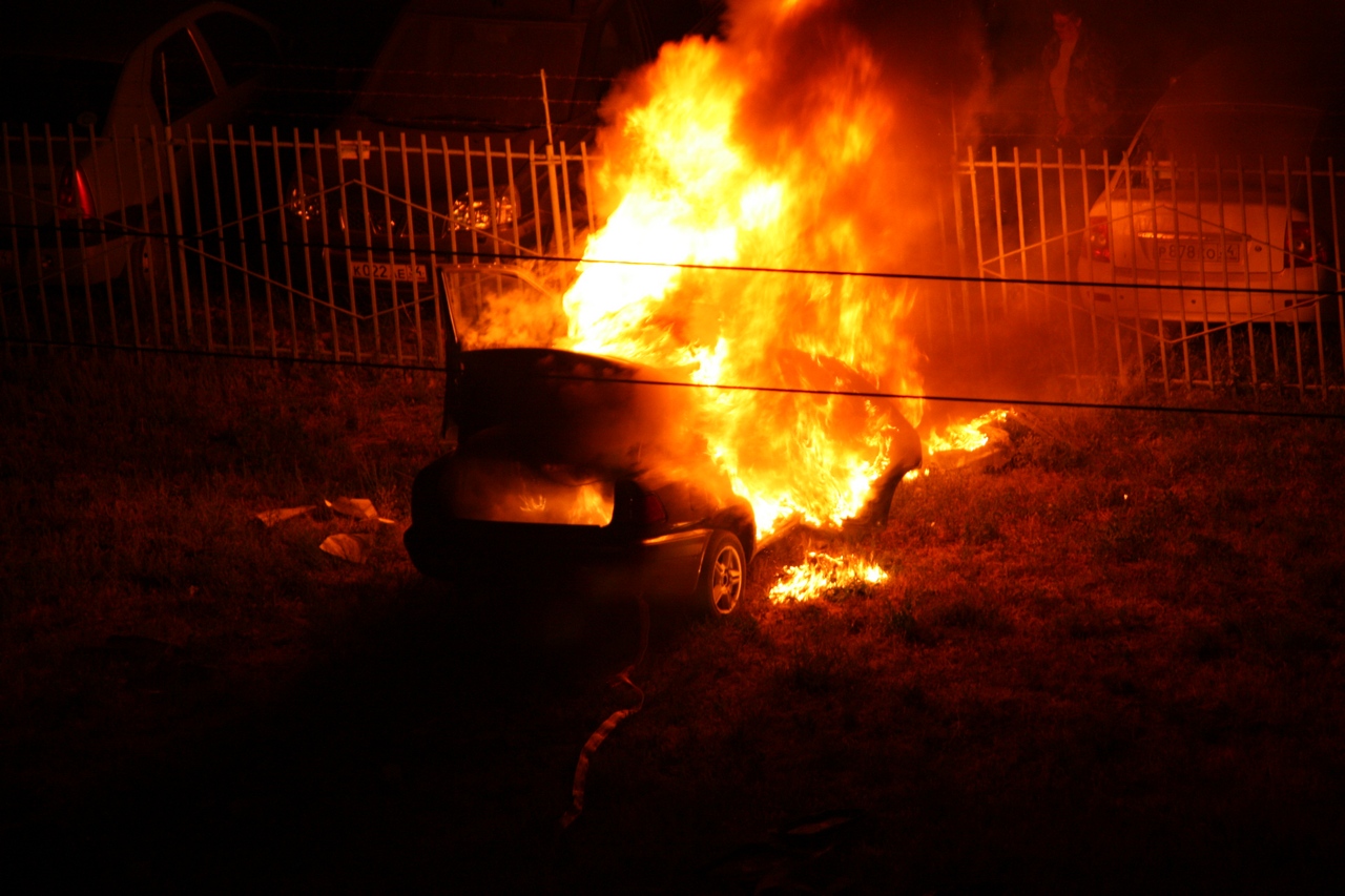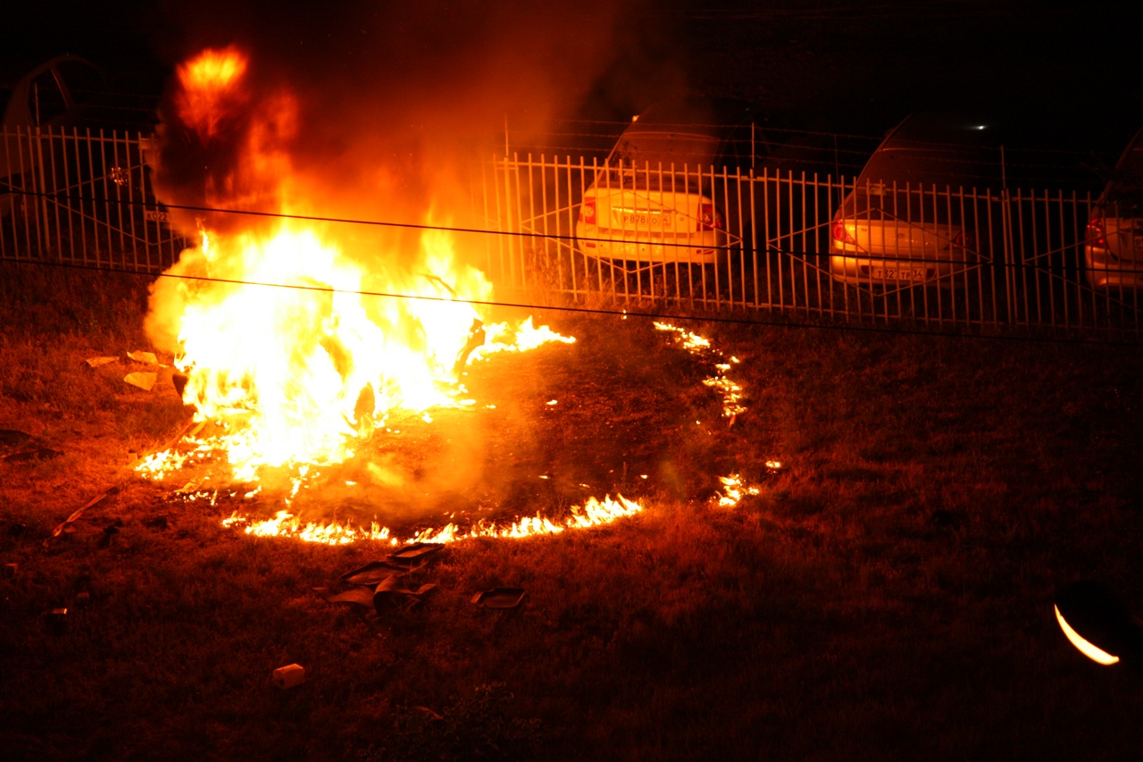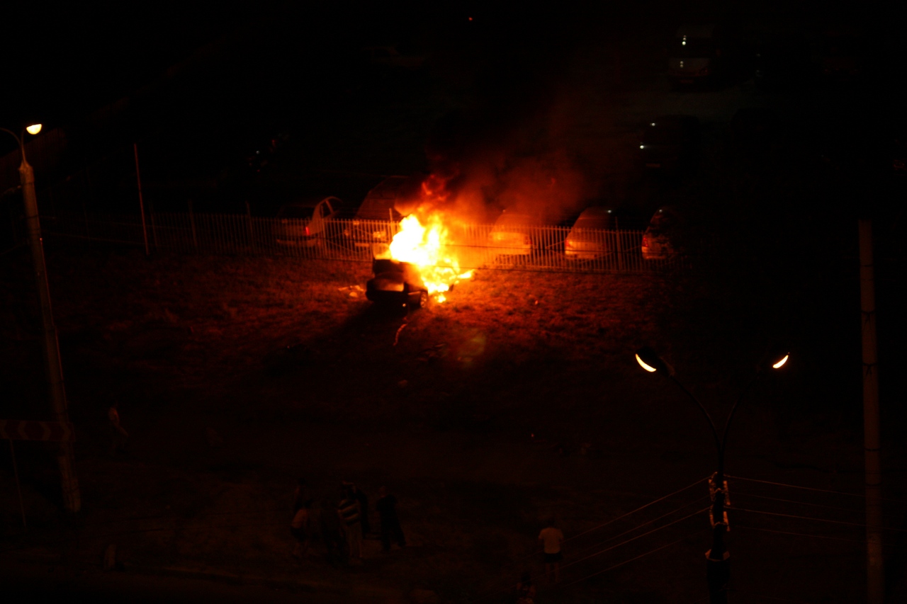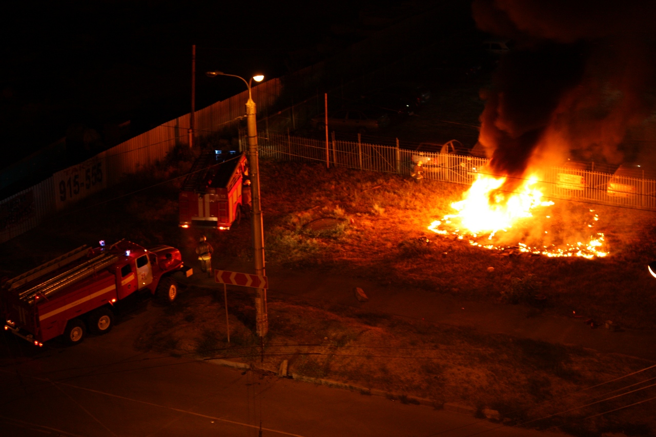 На скорости налетела на бордюр, вылетела на зеленую зону, немного не доехала до забора стоянки и загорелась. Водителя увезли на скорой. Пожарные приехали, как обычно. Коврики сохранились, их заботливо вытащили. Еще пытались оттащить машину, но слишком шустро она горела и была опасность взрыва бензобака. Все это произошло сегодня ночью. Можно сказать, что машинки на стоянке за забором произведены в рубашке.
