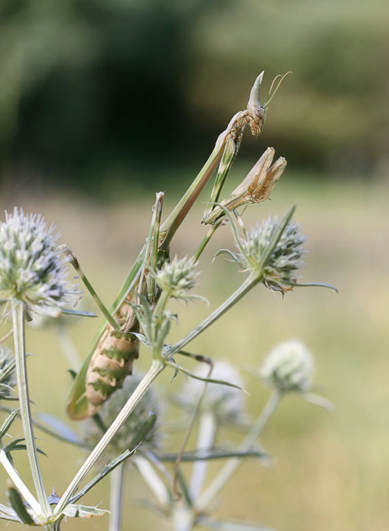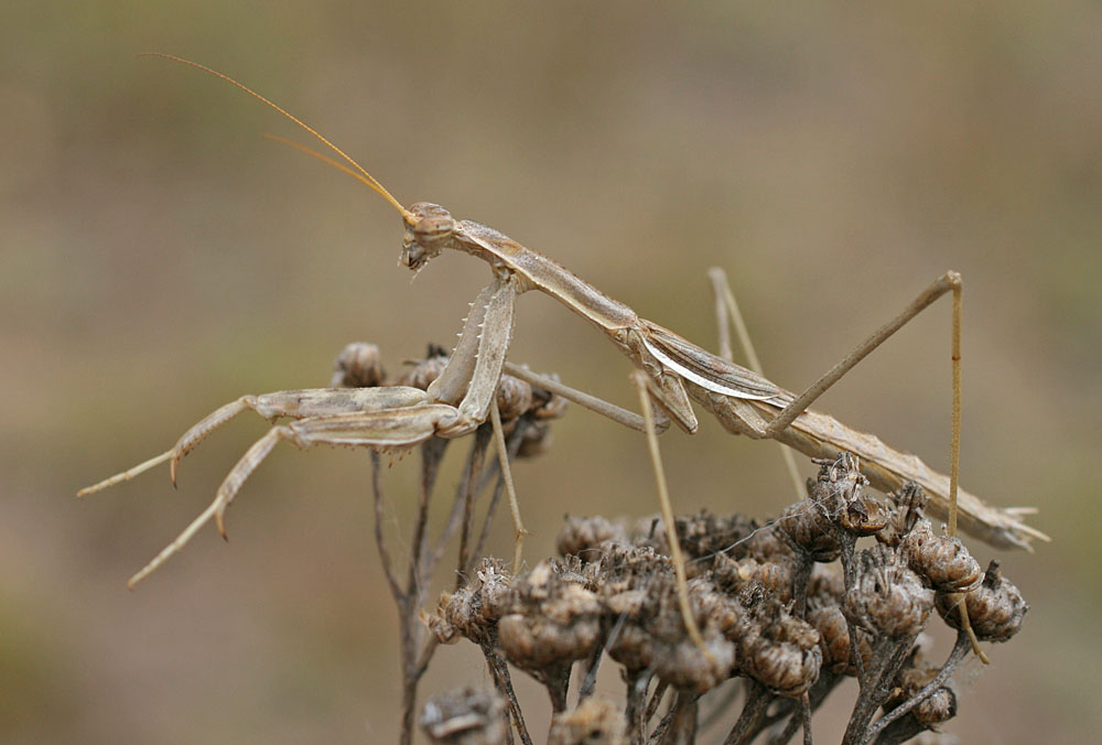 Раз уж речь зашла про богомолов, предлагаю кратенький ликбез. У нас в области обитают 4 вида эти хищных насекомых: Короткокрылая боливария 1 - самка 2- самец Перистоусая эмпуза 3 - самка, 4 - самец, 5 - личинка Пятнистокрылый богомол 6 - самка, 7 - самец Обыкновенный богомол 8 - самка, 9 - самец Боливария - бескрылый степной вид, в Красной книге Волгоградской области. У пятнистокрылых богомолов крылатые только самцы, самки имеют укороченные крылья. У эмпуз самки никогда не съедают самцов, да и вообще каннибализм для этого вида нехарактерен. Для человека эти насекомые безобидны, разве только обыкновенный богомол может ущипнуть передними лапками, но это несерьёзно.