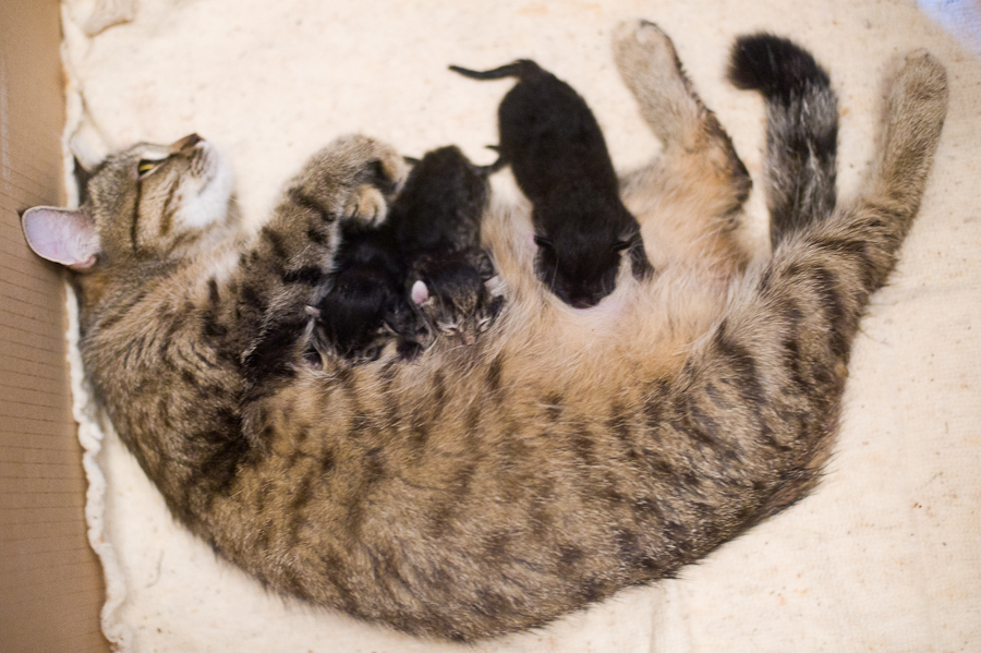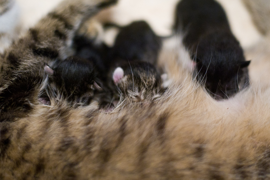 из кошки вышло 2 последыша.. один на первых двух, второй на третьем ) все прошло без проишествий молодая мать пытается отдохнуть... но сиськососы ей сомневаюсь что позволят))) вот мы на первом месяце беременности