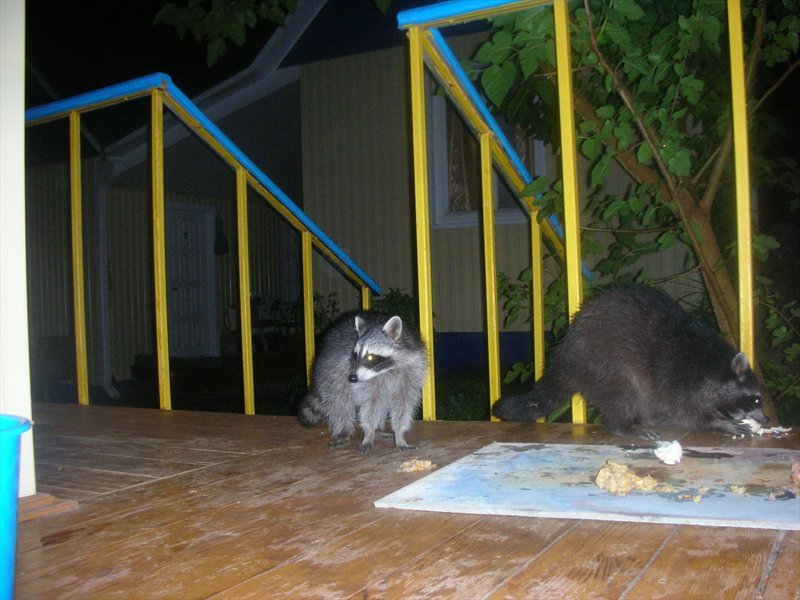 Первые два дня вообще то смутно помню, была семья со Ставрополя и с Екатеринбурга, с мужиками...пиво...вино...водочка...короче отмечали совместно начало отдыха. Помню что женщины на следующий день жаловались, что ночью кастрюли гремят, вроде как коты местные рыскают, одна сказала что видела ночью большого хомяка с повязкой на глазах. Ну посмеялись конечно, выпили за хомяков а утром было не до смеха...повесил вечером на верёвке чехонь досушивать...одни головешки и хвосты остались... Самоё интересное, что этот рыжий кот на фото, всё время появлялся за пять минут до прихода семейки енотов, осторожно всё осматривал, обнюхивал, пробовал еду и только затем появлялись эти зверьки. Кот отходил немного в сторону и наблюдал как эта семейка ужинает. Иногда к нему подбегал самый маленький енот и игрался с его хвостом, кот сидел спокойно и практически на это не реагировал и только когда сильно надоедал ему начинал шипеть на мелкого... Короче, через неделю вечерней кормёжки женщинами, днём вся семейка, вместе с рыжим котом, отсыпались под одним из домиков а вечером, строго с 21. 00. появлялись в полном составе на веранде домика. ...не смог сразу сфоткать троих енотов, папа с мамой ужинают а мелкий схватит что нибудь и сразу убегает...