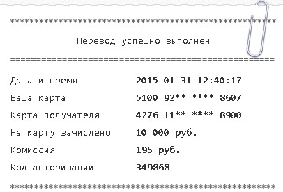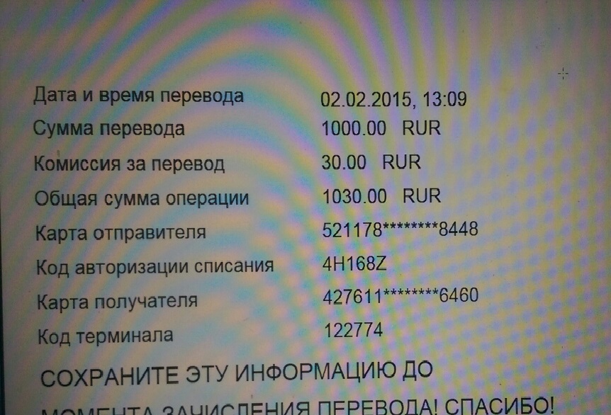 Тип перевода : Перевод по России Сумма перевода : 1 500,00 RUB Сумма платы за перевод : 50,00 RUB Номер карты отправителя : 5100 #### #### 5606 Код авторизации списания : 270862 Карта получателя Платежная система : Visa International Номер карты получателя : 4276 #### #### 6460 Код авторизации зачисления : 845923 ---------- Сообщение добавлено 02.02.2015 12:18 ---------- Отправил чуток