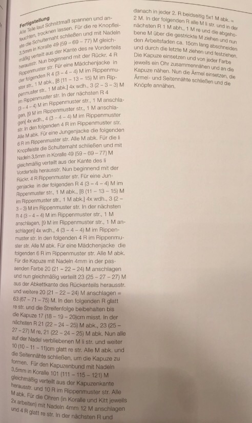 Маришка, у меня тоже со временем не очень. Что смог Вот оригинал в текстовом формате: Спойлер Fertigstellung Alle Teile laut Schnittmaß spannen und anfeuchten, trocknen lassen. Für die re Knopfleiste die Schulternaht schließen und mit Nadein 3,5mm in Koralle 49 (59 - 69 - 77) M gleichmäßig verteilt aus der Kante des re Vorderteils herausstr. Nun beginnend mit der Rückr. 4 R Rippenmuster str. Für eine Mädchenjacke in der folgenden R 4 (3 - 4 - 4) M im Rippenmuster str., 1 M abk., [8 (11 - 13 - 15) M im Rippenmuster str., 1 M abk.] 4x wdh., 3 (2 - 3 - 3) M im Rippenmuster str. In der nächsten R 4 (3 - 4 - 4) M im Rippenmuster str., 1 M anschlagen, [9 M im Rippenmuster str., 1 M anschlagen] 4x wdh., 4 (3 - 4 - 4) M im Rippenmuster str. In den folgenden 4 R im Rippenmuster str. Alle M abk. Für eine Jungenjacke die folgenden 6 R im Rippenmuster str. Alle M abk. Für die li Knopfleiste die Schulternaht schließen und mit Nadeln 3,5mm in Koralle 49 (59 - 69 - 77) M gleichmäßig verteilt aus der Kante des li Vorderteils herausstr. Nun beginnend mit der Rückr. 4 R Rippenmuster str. Für eine Jungenjacke in der folgenden R4 (3- 4-4) M im Rippenmuster str., 1 M abk., [8 (11 - 13 - 15) M im Rippenmuster str., 1 M abk.] 4x wdh., 3(2- 3-3) M im Rippenmuster str. In der nächsten R 4 (3 - 4 - 4) M im Rippenmuster str., 1 M anschlagen, [9 M im Rippenmuster str., 1 M anschlagen] 4x wdh., 4 (3 - 4 - 4) M im Rippenmuster str. In den folgenden 4 R im Rippenmuster str. Alle M abk. Für eine Mädchenjacke die folgenden 6 R im Rippenmuster str. Alle M abk. Für die Kapuze mit Nadeln 4mm in der passenden Farbe 20 (21 - 22 - 24) M anschlagen und nun gleichmäßig verteilt 23 (25 - 27 - 27) M aus der Abkettkante des Rückenteils herausstr. und weitere 20 (21 - 22 - 24) M anschlagen = 63 (67 - 71 - 75) M. In den folgenden R glatt re str. und die Streifenfolge beibehalten bis die Kapuze 17 (18 - 19 - 20)cm misst. In der nächsten R 21 (22 - 24 - 25) M abk., 23 (25 - 27 - 27) M re, 21 (22 - 24 - 25) M abk. Nun alle auf der Nadel verbliebenen M li str. und weiter 10 (10 -11 - 11)cm glatt re str. Alle M abk. und die Seitennähte schließen, um die Kapuze zu formen. Für den Kapuzenbund mit Nadeln 3,5mm in Koralle 101 (111 - 115 - 121) M gleichmäßig verteilt aus der Kapuzenkante herausstr. und 10 R im Rippenmuster str. Alle M abk. Für die Ohren (in Koralle und Kitt jeweils 2x arbeiten) mit Nadeln 4mm 12 M anschlagen und 4 R glatt re str. In der nächsten R und danach in jeder 2. R beidseitig bxl M abk. =2 M. In der folgenden R alle M li str. und in der nächsten R 1 M abh., 1 M re und die abgehobene M über die gestrickte M ziehen und nun den Arbeitsfaden ca. 15cm lang abschneiden und durch die letzte M ziehen und festziehen. Die Kapuze einsetzen und von jeder Farbe jeweils ein Ohr zusammennähen und an die Kapuze nähen. Nun die Ärmel einsetzen, die Ärmel- und Seitennähte schließen und die Knöpfe annähen. Что за фигня? Почему теги не работают?!