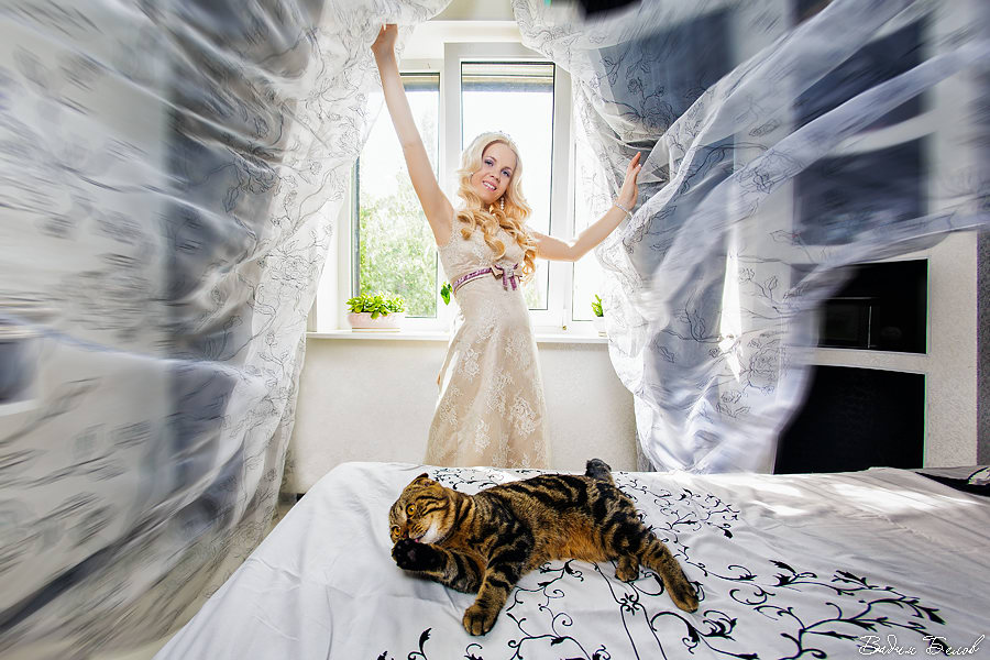Тогда это не свадебная фотография, а анимал-фото! Ибо кот - шикарен и перетягивает на себя все внимание с невесты. О! я поняла! Вы кота женили что ли?