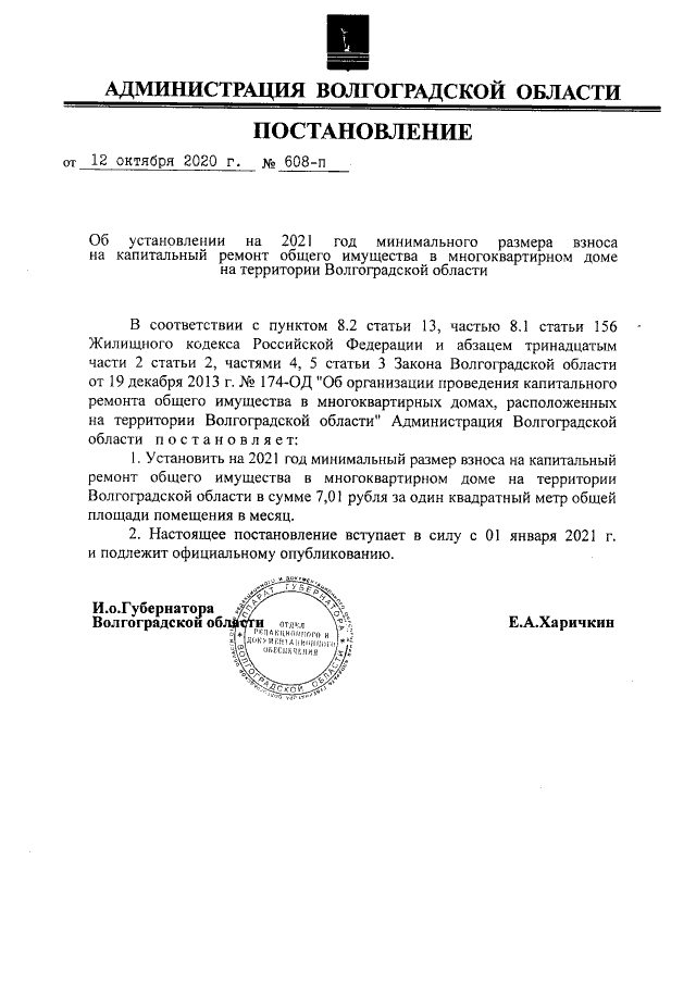 Не совсем он, но Администрация Волгоградской области в лице И.о. Губернатора Харичкина Е.А. постановлением 608-п от 12.10.2020 А что с губернатором то случилось? Почему вдруг и.о. появился? А здесь ошибка. Кто-то придержал это постановление до этого дня. Видимо, была какая-то государственная важность, что было засекречено.