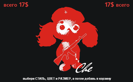 И... № 4 "Че Гемаус": Соединив 2-х положительных персонажей, получаем стёбный вариант мультипликационного революционера. Nimfea добавил [date]1079343826[/date]: ЧеШирский Кот В все еще "Хотите быть таким, как Че Гевара?"??? ... слава, к сожалению, всегда идет бок о бок с чванством будущих поколений.