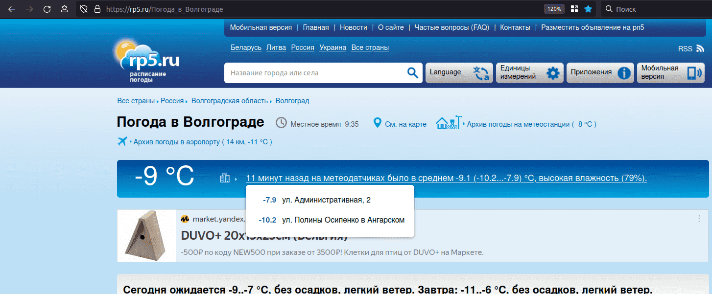 А где вы находитесь? Свою высоту над уровнем моря знаете? Прямо сейчас мой показометр в пересчете на миллиметры выдает 779. Гисметео показывает сейчас 769. Неизвестно, впрочем, насколько актуально это «сейчас». Если он дает информацию с метеодатчика аэропорта, то все сходится. Метеоплощадка эта на 72 метра выше моего дома, разница должна быть 7 мм, итого у меня должно быть 776. (10 м высоты примерно соответствует 1 мм.рт.ст. Плюс-минус ошибка высотомера, я его калибровал 37 лет назад в барокамере по образцовому барометру). Яндекс дает «сейчас» 775, неведомо с какой метеостанции. А вообще я раньше замечал, что яндекс пересчитывал давление на уровень административного центра. Upd. Ага, нашел в архиве погоды датированные данные с аэропорта. В 9:30, сорок минут назад, показания 769,7. Похоже, мой показометр завышает на 2 мм. Кстати, о разбросе температур по городу.