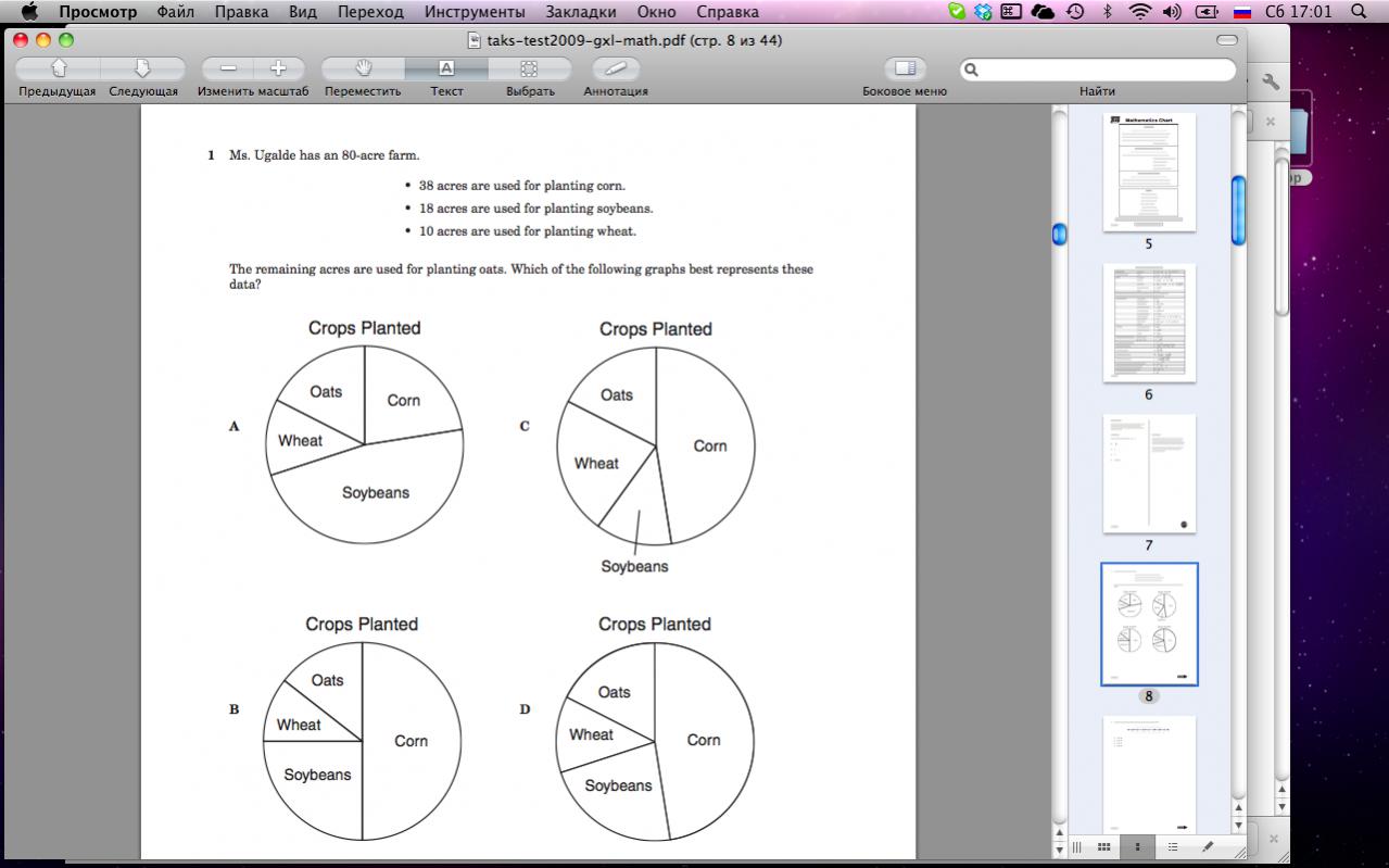Invader, дело не в библиотеках, а в том, что сначала нужно нормальные навыки письма, чтения, работы с информацией, а потом уже ставить перед детьми задачи самостоятельного изучения темы. А в возрасте 7-ми лет рассчитвать, что они сами проработают тему "Тепловые пояса земли" - это бред. Когда я училась в школе мы от простого шли к сложному, от сбора информации о мире, к его описанию и выведению закономерностей. А сейчас на ребенка просто вываливают закон всемирного тяготения в 7 лет... Как он может понять тему, если еще не знает, что такое масса, вектор и т.д.? И без участия родителей/репетиторов, его самостоятельная работа - фикция, подставление слов в рабочую тетрадь, не понимая сути. О чем автор "Классной Америки" и пишет. Результат такой учебы - посмотри на их (американские) выпускные тесты. Даже если сравнить тесты за 9 класс по математике и выпускные - вообще не понятно, что они еще три (!) года учат. Первое задание в выпускном тесте по математике за 12 класс, 18 летний человек его "решает": Суть задания в том, чтобы выбрать диаграмму максимально точно отражающую распределение посевов разных культур на 80-ти акровой ферме. Т.е. нужно сделать два действия: вычислить сколько акров идет на овес (сложение и вычитание двухзначных чисел - 2 класс российской школы и вычислить долю каждого в общем объеме посева - видимо 3 класс российской школы, пока она по инерции еще работает). Причем по сути - можно даже не вычислять долю, а путем сравнения найти правильную диаграмму.