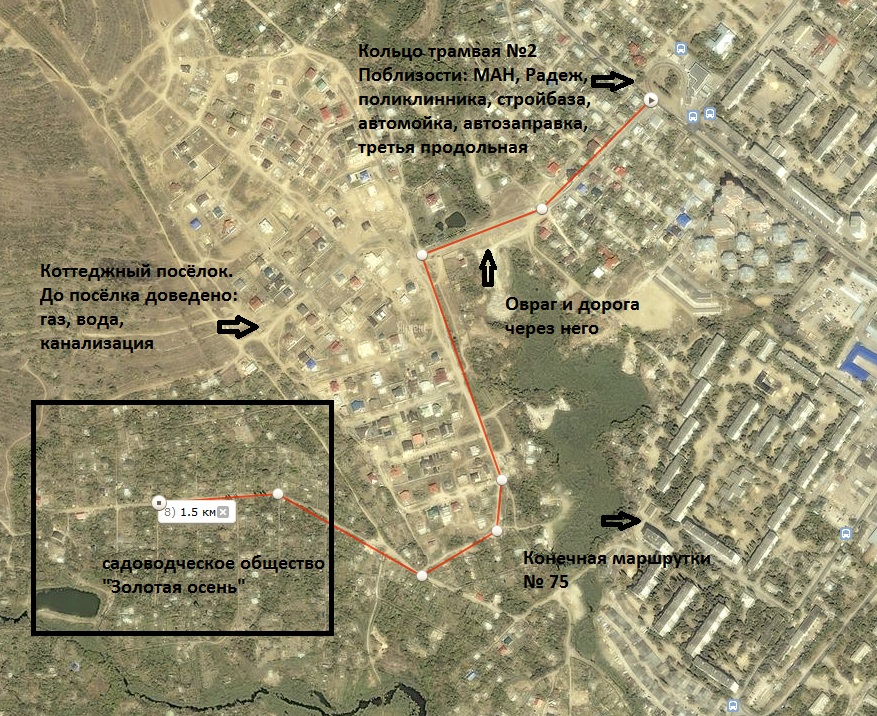 Я на схеме постарался отобразить путь от конечной трамвая №2 "Школа №36" до дачи. Длинна этого пути около 1,5км. Если идти от конечной маршрутки №75 то путь до дачи 900м.