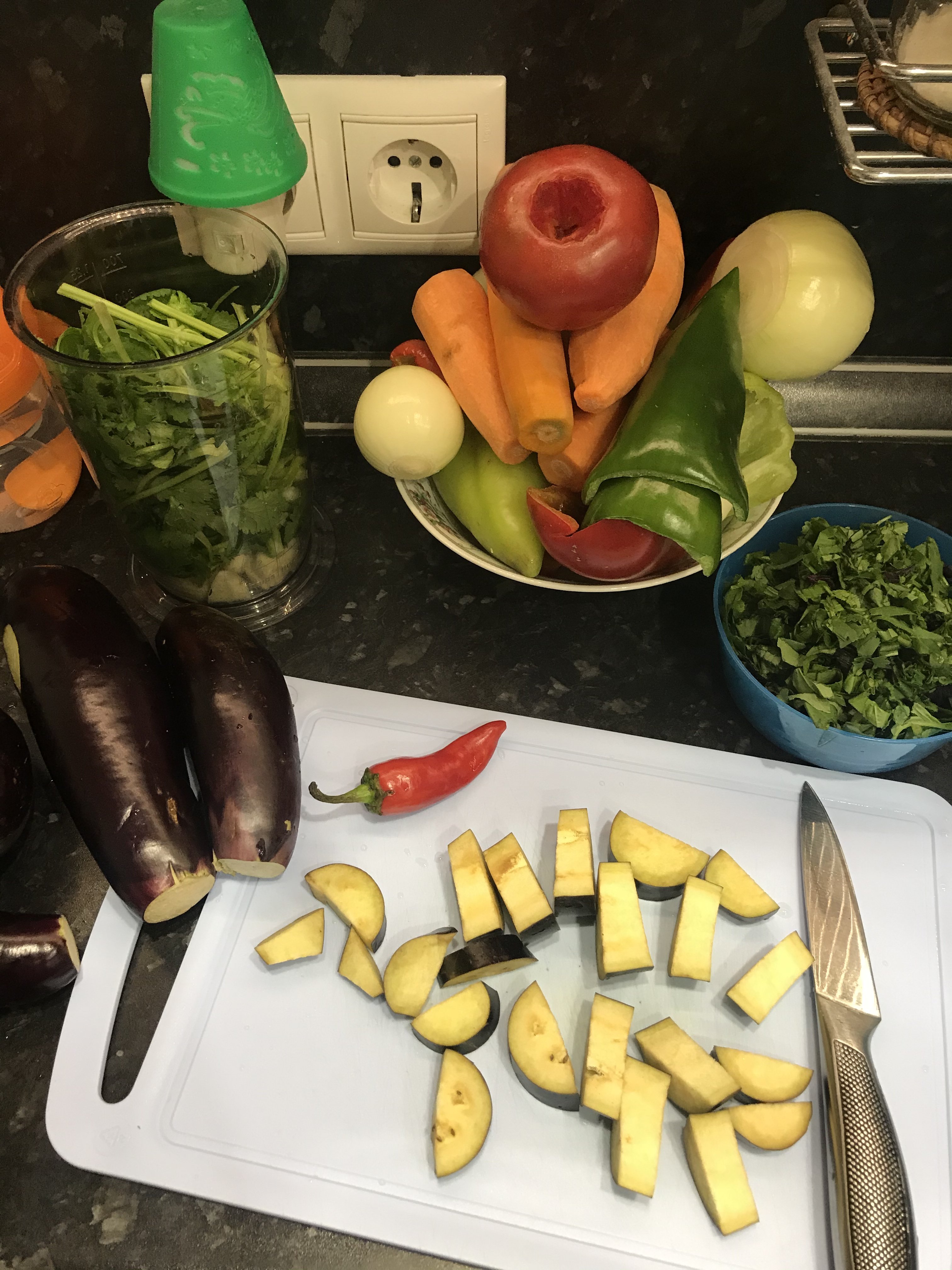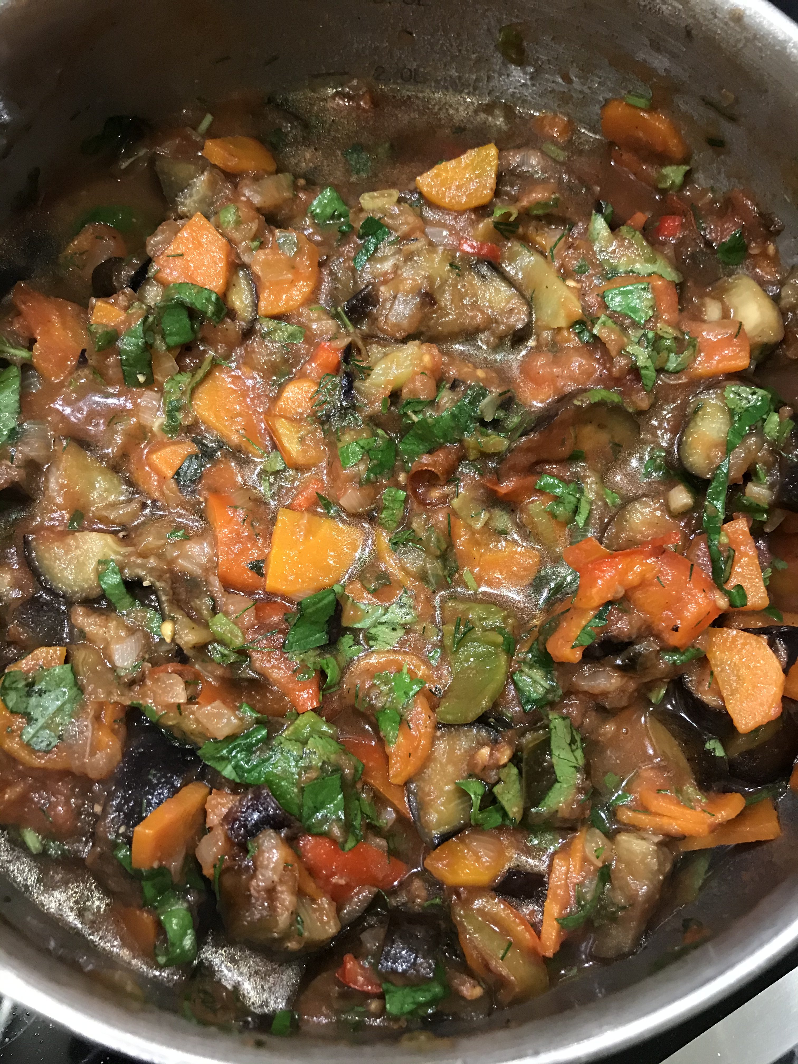 Аджапсандали. Гуглила я рецепты, читала читала и вычитала, что вариаций много) В каждой семье свои нюансы. Кто без моркови, кто картофель или мясо добавляет, кто-то отдельно обжаривает, или запекает, или тушит сразу всё вместе. Я выбрала на первый раз обжарить отдельно. Баклажаны предварительно посыпала солью, оставила на 30 минут, потом помыла и отправила жариться, 15 минут. Переложила в кастрюлю. Обжарила под крышкой болгарский перец, 15 минут и отправила к баклажанам. Лук жарила 3 минуты, добавила морковь, перемешала и жарила под крышкой 20 минут, отправила к баклажанам. Помидоры измельчила (без кожуры) и к баклажанам. Добавила острый перец. Добавила Специи. Тут у меня был сбой, я хотела готовить с уцхо-сунели, но забыла купить, потому, добавляла что было: кориандр, чёрный перец, хмели-сунели (вот вместо хмели, хотела уцхо). Добавила Зелень. Планировала зелёный лук, петрушку, базилик фиолетовый. Всё это было, но добавила ещё укроп, зелёный базилик и часть кинзы. Перемешала, потушила на медленном огне, 15 минут. Вторую часть кинзы измельчила с чесноком и солью и отправила в кастрюлю. Всё перемещала и выключила огонь.