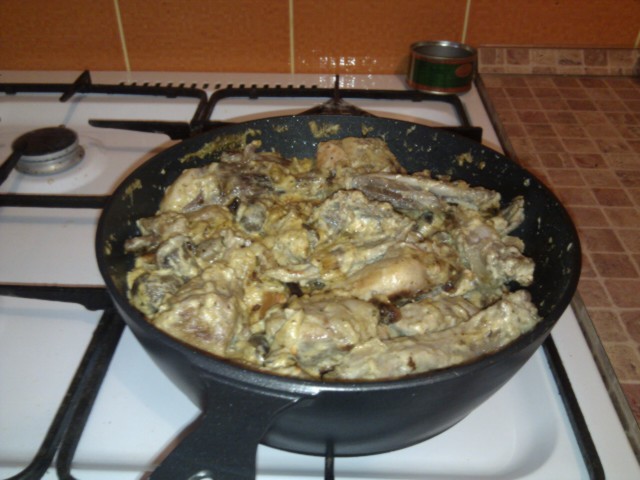 в собственном соку. его выделилось с полсковородки. 100% согласен, повелся на его дешивизну в Реале, но! может поэтому оно и не подгорало (что в составе приготовляемого блюда оказалось растительное масло) я был не прав (о вкусе). отужинали. общее мнение - нечто среднее между кроликом и говядиной.