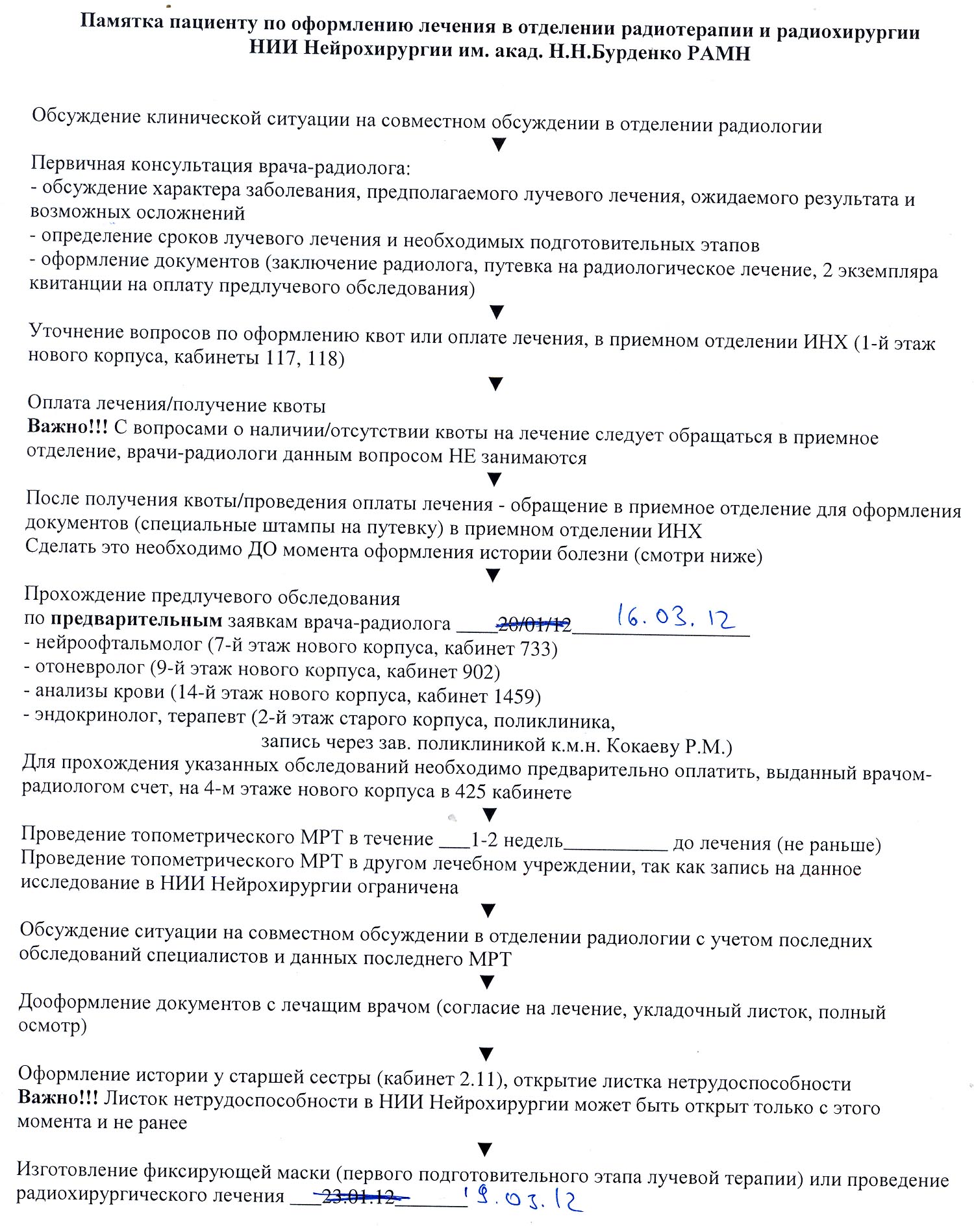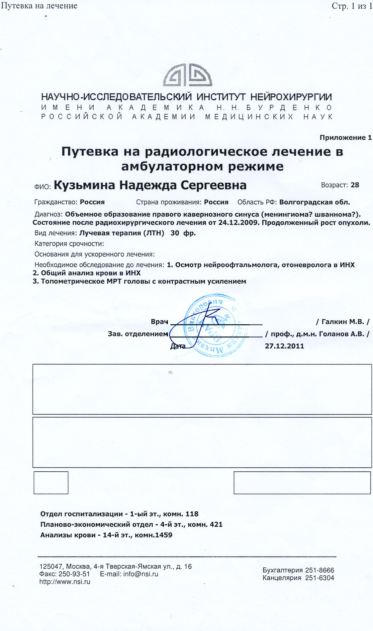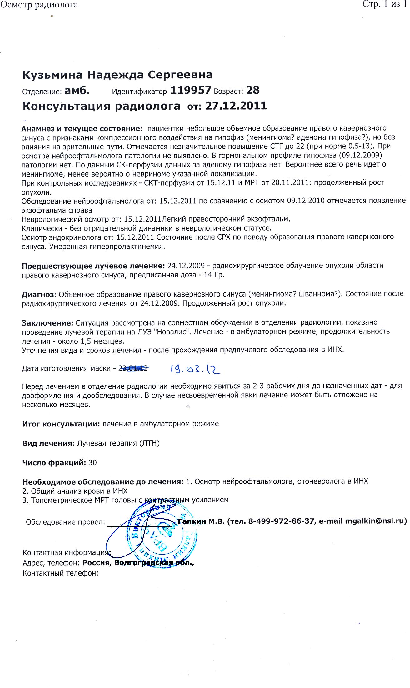 Уважаемые форумчане и все, кто не остается равнодушным!!! Сроки лечения перенесли! Мы просили врачей сдвинуть сроки и они пошли Надежде навстречу, изыскали возможность отложить лечение до 16 марта (в сканах оригиналов вы можете увидеть исправление ручкой поверх первой даты). Это дает нам больше шансов: получить квоту или собрать необходимую сумму. Квоты на сегодняшний день пока, как и предполагалось, нет. Денег также собрано недостаточно (и честно говоря, вряд ли успели бы к 20-му числу). Огромное спасибо всем, кто помогает нам собирать средства, а также тем, кто распространяет информацию, да и просто поддерживает морально! Для Надежды это, поверьте, очень, и очень, и очень важно. Я лично очень надеюсь, что за эти 2 месяца ее состояние не ухудшится (уже начал проявляться дискомфорт в глазу от давления опухоли). Теперь праздники не мешают, и мы на связи с институтом и нейрохирургами-радиологами. И продолжаем собирать средства (напомню, что если средства по какой-либо причине не понадобятся, он будут переданы другим нуждающимся). Промежуточный итог-отчет за 10.01.2012 8600 - сберсчет 39050 - сберкарта Надежды 15000 - наличные 4767,88 - Яндекс-деньги 6000 - у Светы Zazell 10200 - на счету в "Альфе" 36$ (примерно 1000 рублей) Итого: 84617,88 рублей.