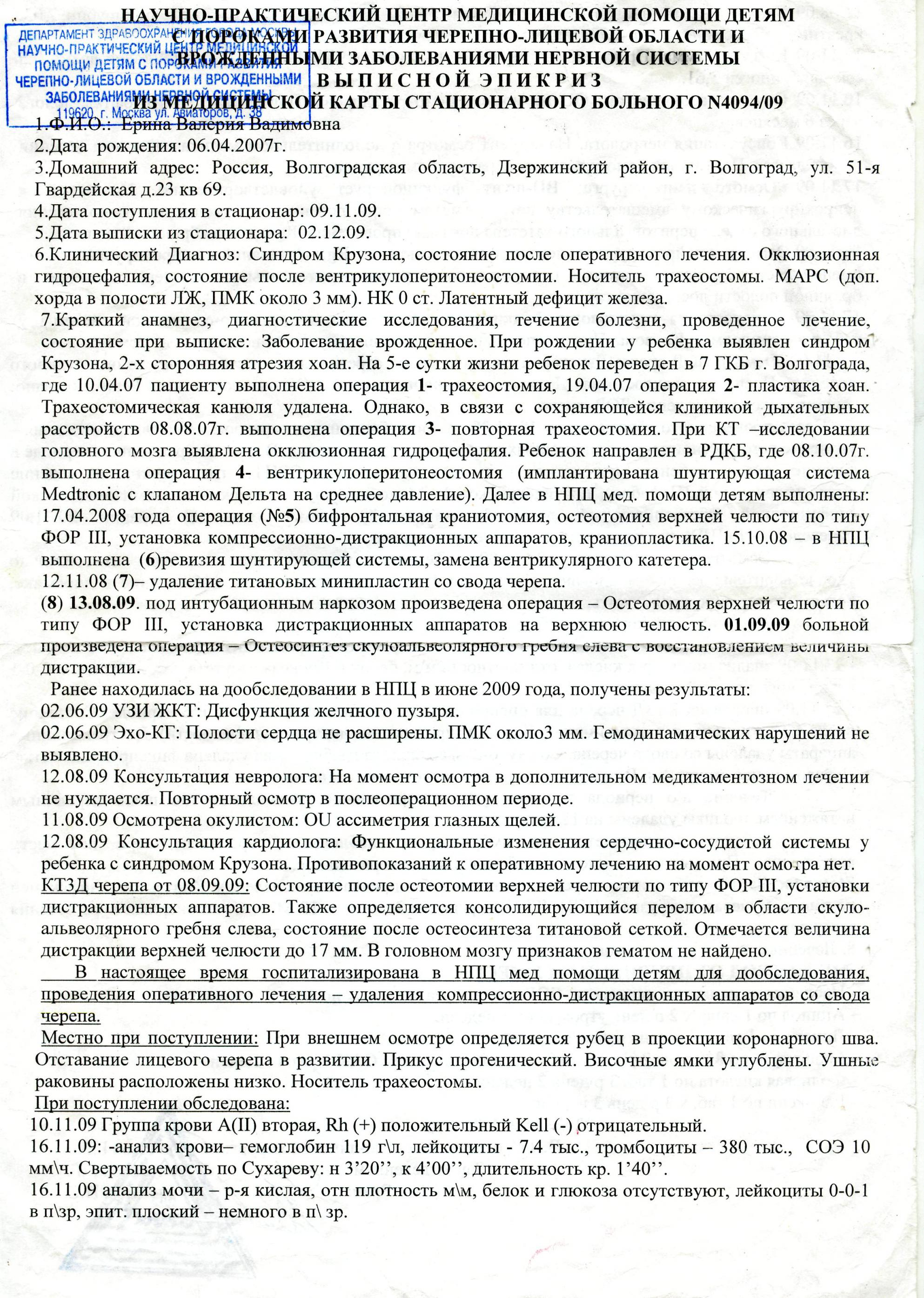 Уважаемые форумчане! Знакомьтесь: это Лера Ерина, наша маленькая землячка. Лера живет в Дзержинском районе (Жилгородок). Ей четыре с половиной года. У Леры очень редкое генетическое расстройство - синдром Крузона (на не медицинском языке это означает, что швы черепа преждевременно срастаются и не дают расти средней части лица). Помимо эстетической проблемы, это заболевание, если его не лечить, приводит к неминуемому поражению головного мозга. Кроме того, у Леры есть сопутствующее заболевание - закрыты носовые ходы, девочка дышит через трубочку в шее (трахеостому). Всю свою короткую жизнь девочка лечится, в больницах с мамой практически живёт. Лера перенесла уже 13 операций, и сколько их впереди - трудно предположить. Чтобы кости черепа могли как-то расти, девочке до 12 лет нужно постоянно делать операции по пластике черепа. Проблема в том, что заболевание Леры крайне редкое, не в ходит в список квотируемых государством. То есть лечение больной девочки государство практически полностью переложило на плечи семьи. Профильное учреждение, где девочке делали операции по пластике черепа - НПЦ Медицинской помощи детям с пороками развития челюстно-лицевой области и врожденными заболеваниями нервной системы. Одна операция по пластике черепа стоит 10 тыс. евро. В семье двое детей, работает только папа, так как девочка нуждается в постоянном присмотре и уходе. Все материальные возможности семьи давно исчерпаны - а ребенка нужно регулярно обследовать и оперировать! Последние операции по пластике черепа оплачивал спонсор, но на данный момент он оказался в кризисе и остался долг с предыдущей операции около 10 тыс. долларов. И теперь клиника всячески затягивает со следующей операцией. Кроме того, она не выставляет официальных счетов, что лишает семью Леры возможности обратиться в благотворительные фонды. Да и качество помощи, как говориться, НЕ на лицо, ребенок до сих пор не избавился от трахеостомы, не дышит носом. Поэтому мама девочки стала искать возможность обследовать и лечить малышку за границей. На данный момент получен счет на обследование Леры Ериной в клинике Ильхов(Израиль). Сумма по счету пока не большая (4080 долларов), это только обследование - но надо с чего-то начинать. Кроме того, понадобятся средства на перелет и проживание в Израиле в течение недели, пока будет длиться обследование. То есть сумма счета в переводе на рубли составляет примерно 131 000 рублей. Ехать с Лерой, видимо, придётся обоим родителям, так как вместе с девочкой нужно везти тяжелые аппараты, что одному человеку не под силу. Поезд Волгоград -Москва Св, либо самолет- туда и обратно 28 000 рублей. Самолет Москва -Израиль туда и обратно - 28 000 рублей. Прожививание в Израиле в Гостинице 7 дней - 35000 рублей. Питание из расчета 1000 рублей один обед в кафе, либо продукты из магазина на один раз - 21000 рублей. ИТОГО: около 112 000 рублей. То есть общая сумма к сбору составляет примерно 243 000 рублей. На данный момент форумом Волго-Мама собрано на карту мамы Леры Ериной Татьяны 43 270 рублей. Прошу Вас дать шанс маленькой девочке на нормальную жизнь! Реквизиты для поступления средств: Банк получателя:Волгоградское ОСБ №8621 г.Волгоград БИК 041806647 кор.счет 30101810100000000647 ИНН 7707083893 КПП 344402001 Волгоградское ОСБ 8621/0008 г.Волгоград л/с № 40817810411004507217 Ерина Татьяна Геннадьевна Номер карты СБ для переводов On-line: №6390021190