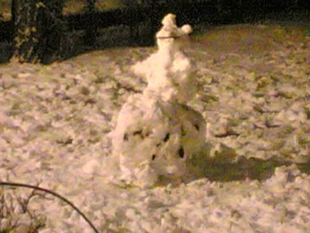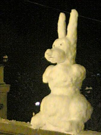 В воскресенье мой дворовый щенок Тимур чуть не охрип: дети на улице играли в снежки. Выйдя вечером на работу, я увидела около дома огромного снеговика... На выходе из Музыкального театра в глаза бросился здоровенный Заяц, такой ушастый, что, отъехав немного, я захотела его снять . Стала искать место припарковаться и обнаружила по всему парку на набережной малые снежные архитектурные формы! Прошла всю набережную. Это было весело, люди с подъемом занимались лепкой и фотографировались. Самих снеговиков можно разделить на три основных группы: люди (мужички - дворники, папы с ребенком; бабищи), звери (мишки, лиса, заяц), небольшие привидения. Эх, наверное, и я сделаю своего снеговичка и украшу ветками от новогодней пихты... Это будет курица на дереве!...