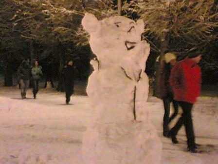 Doctor Zlo, это же лисья морда в профиль. ИМХО. Вместо ушей - лапы сосны. ---------- Сообщение добавлено 18.01.2012 14:20 ---------- minitor, это же маленькие привидения, они сами боятся и поэтому стоят между деревьев ---------- Сообщение добавлено 18.01.2012 14:21 ---------- А почему у снеговиков не должно их быть? Просто в советское время мы не всё знали. ---------- Сообщение добавлено 18.01.2012 14:26 ---------- А в прошлом году у того же Музыкального театра со стороны Лабамбы я увидела снеговика прямо на стволе дерева! Расплюснутого, с раскинутыми руками (и ногами), чью-то жертву...