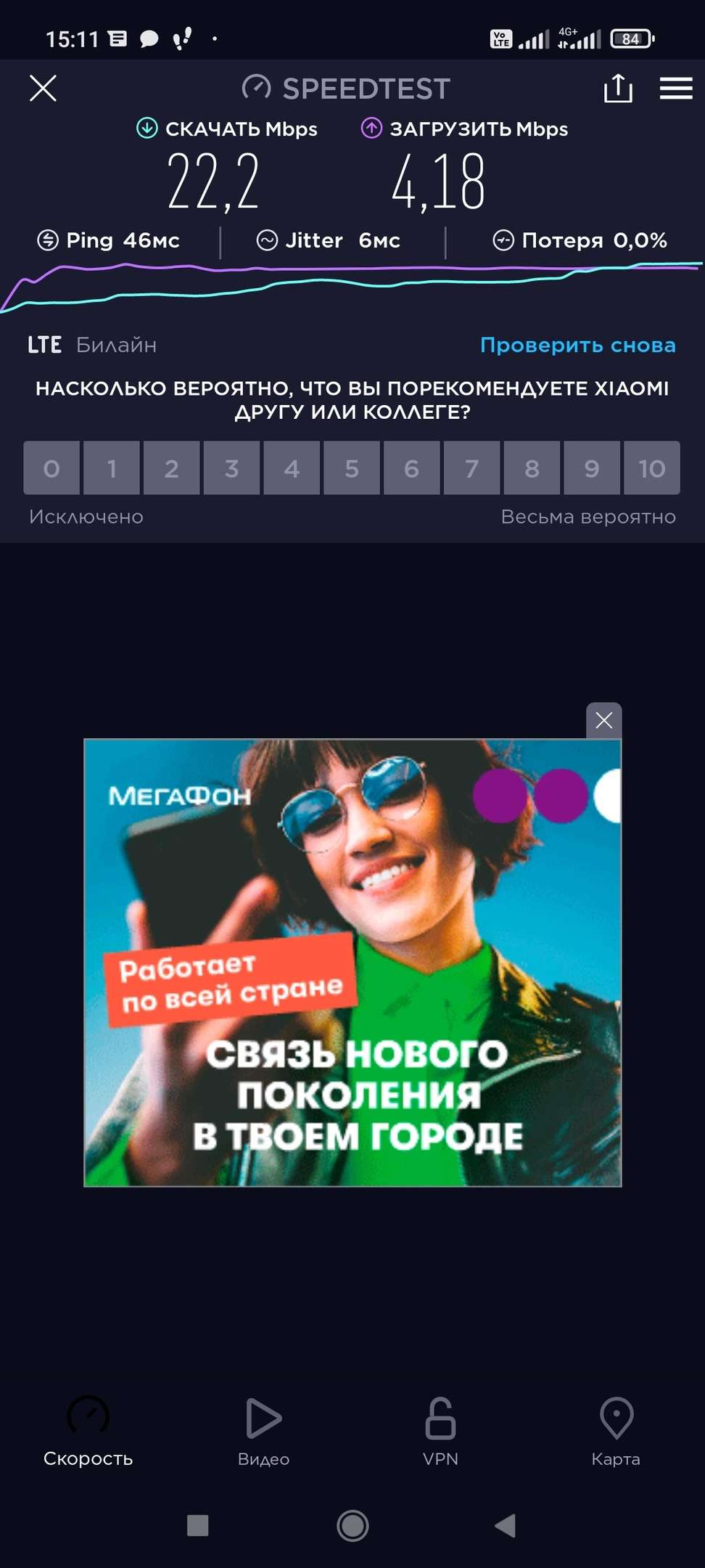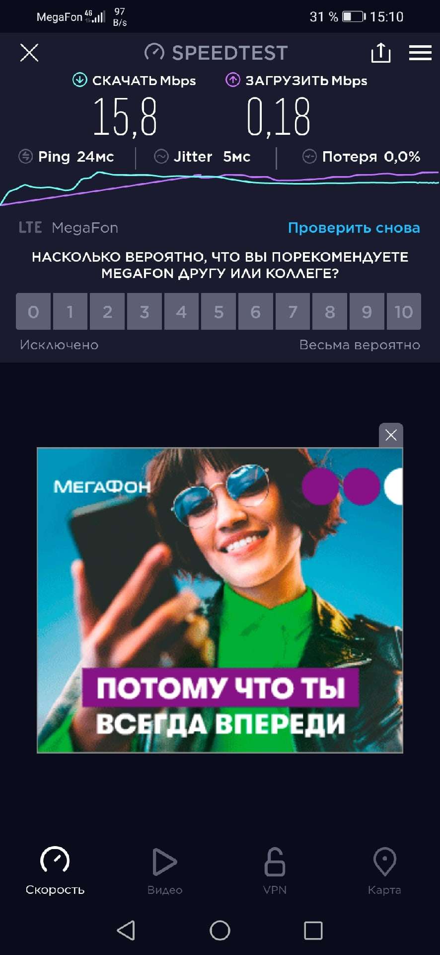 У меня что у одного в городе Мегафон как работал нормально так и работает? Специально сделал тест. Ночью будет ещё быстрее. Спартановка.