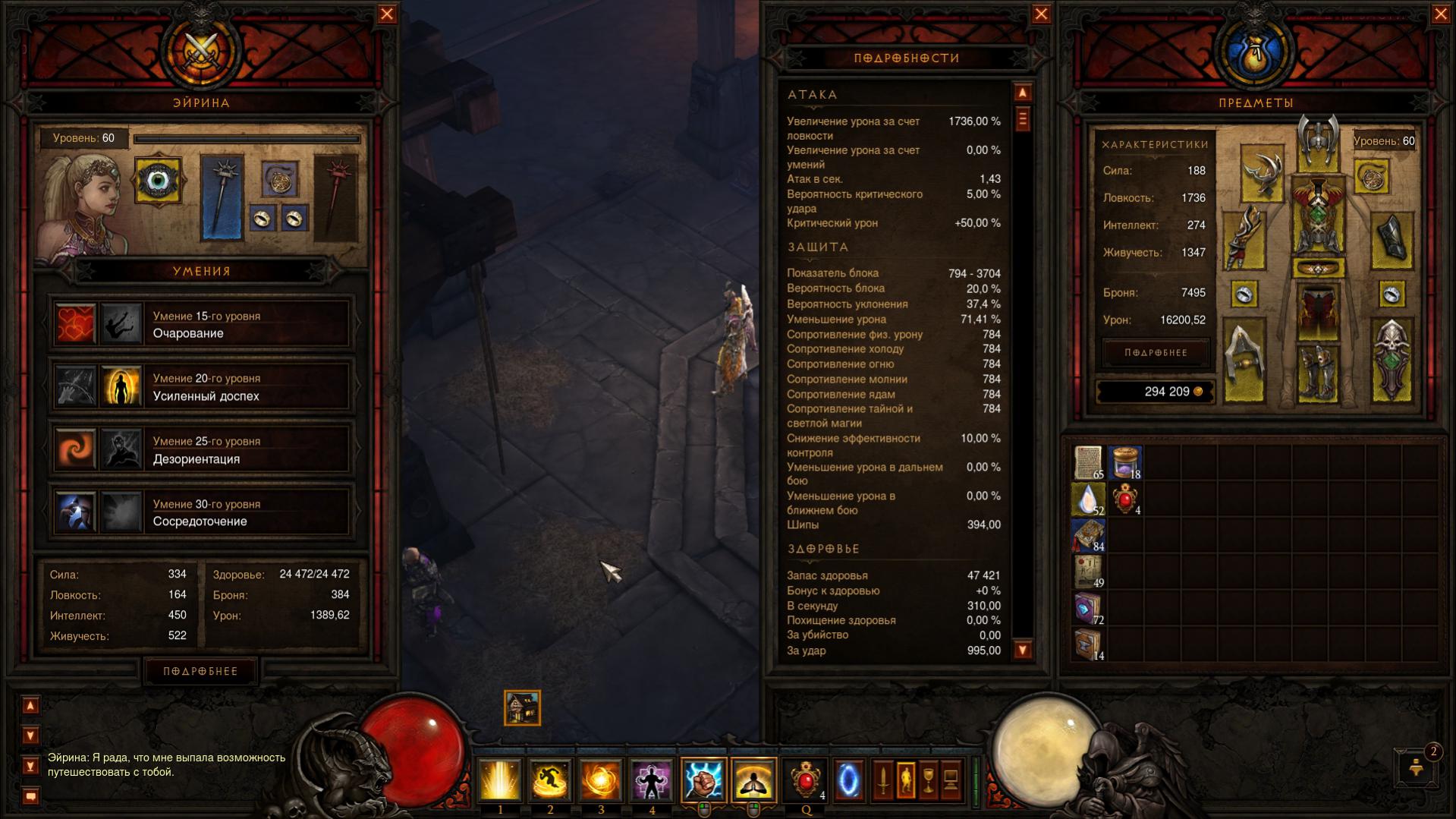 Эту? Ну и вот еще, чтобы не было предположений, что не соло играл)) Резисты под мантрой исцеления становятся равными 941, вполне хватает. ДПС увеличивается до 18600 под постоянным действием "Дыхания Небес" с руной на урон, до 26600 под 3-хсекундным действием "Ослепляющей вспышки" опять же с руной на урон. К тому же у меня в билде есть еще такая классная штука, как ветерок ("Хлещущий ветер"), хз сколько дамажит, но очень неплохо). Практика показывает, что отхиливаюсь, не только с помощью своих 995 ЛПХ, но и за счет того же "Дыхания Небес", 4-хсекундного иммунитета ("Покой"), выпадающих сфер здоровья. К тому же используется самый быстрый генератор духа (Кулаки грома).