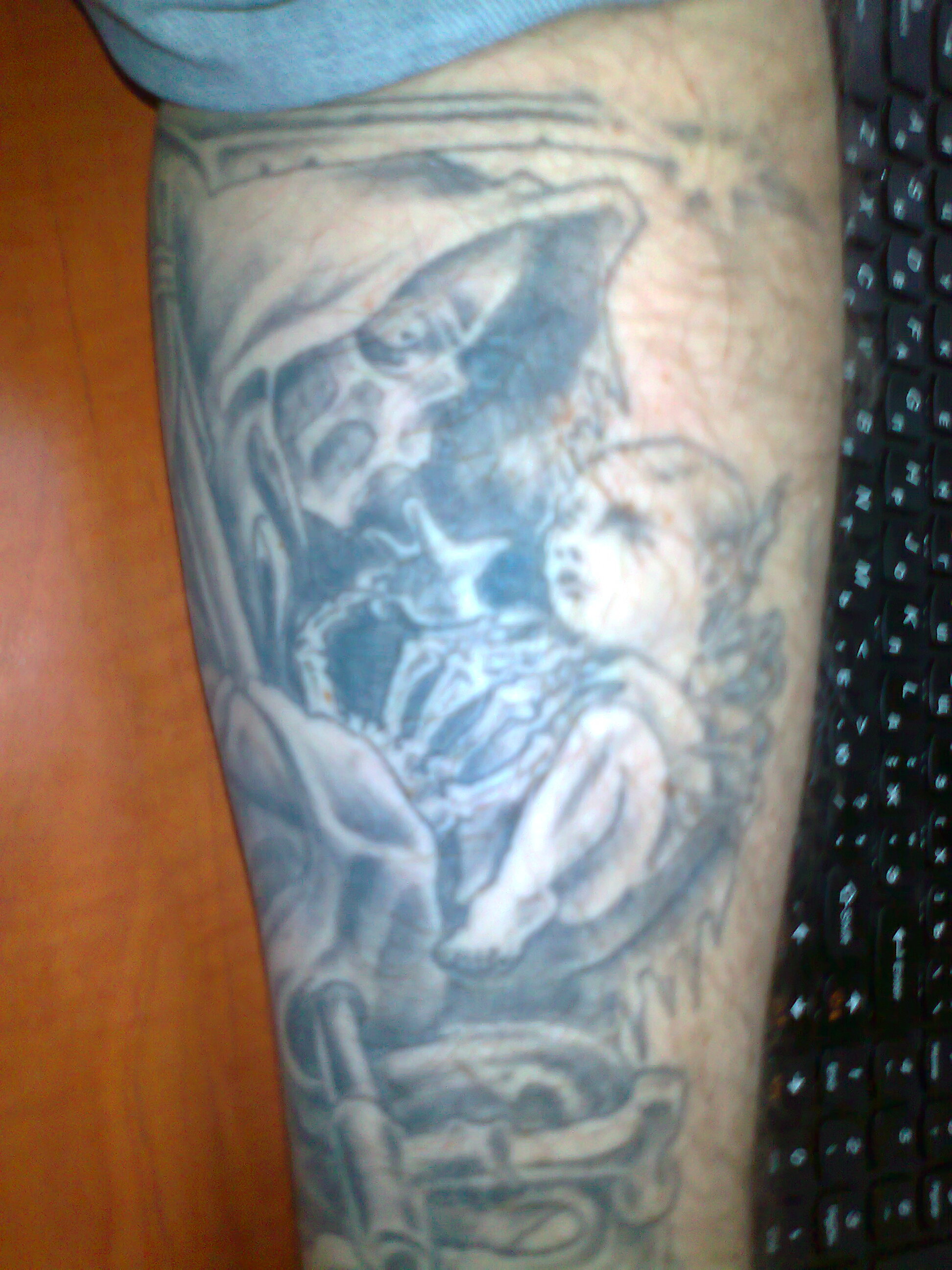 Одну из своих татуировок сделал со своей детской фотографии,-нарисовал во всю руку костлявую с косой и младенцем на рукаах.