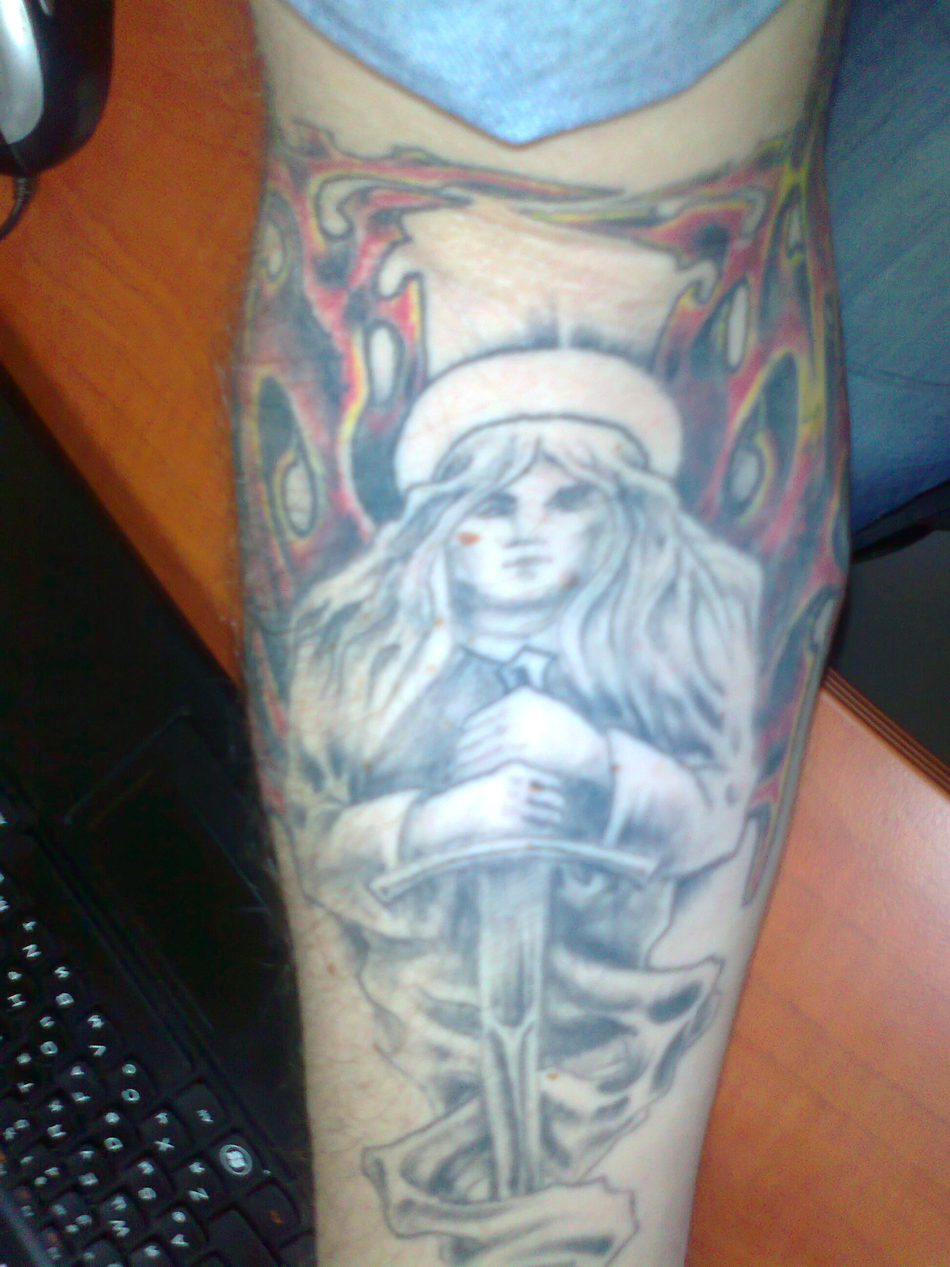 сам говорю ему что нарисовать,он эскизы делает потом выбираю и потом уже делаю тату.Сейчас хочу шею разрисовать. вот вторая рука,ток с телефона фотка косая получается,а если плечи фоткать,то картины вообще не в один фотоапарат не поместятся.