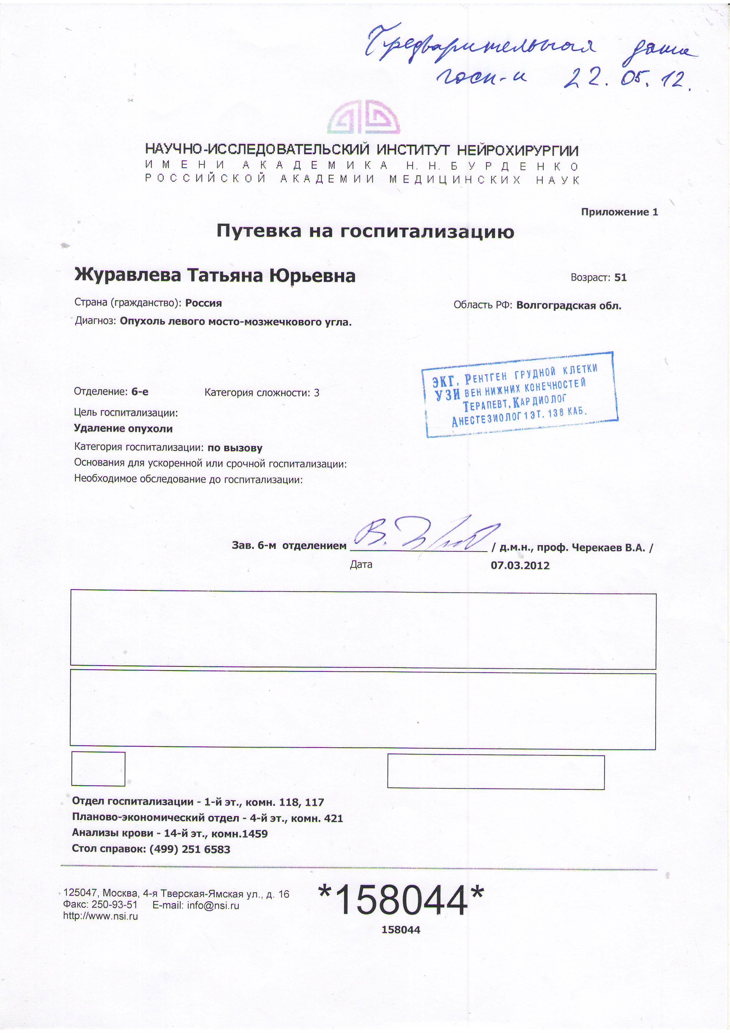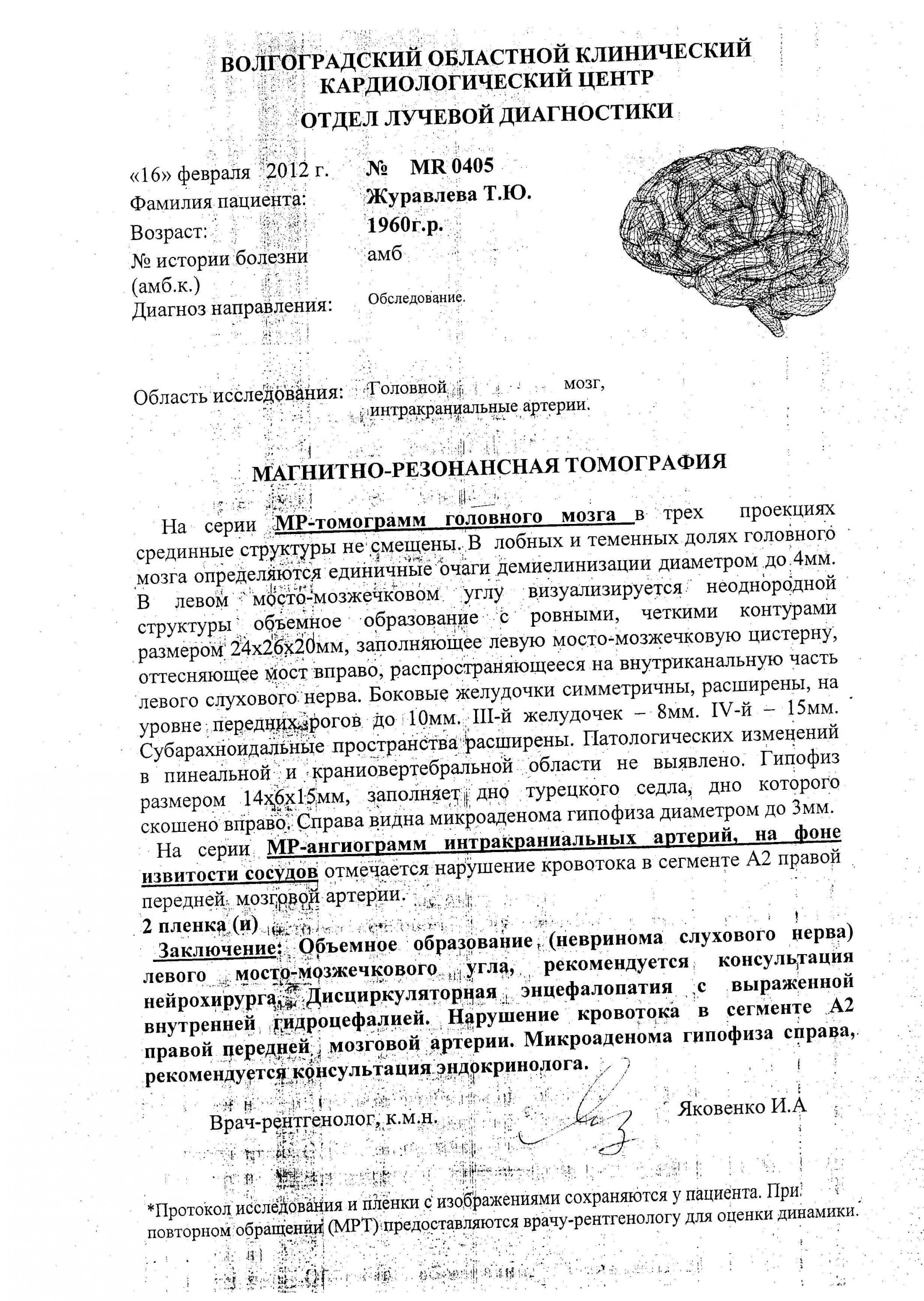 Здравствуйте, хочу познакомить Вас с нашей землячкой Журавлевой Татьяной Юрьевной, 1960 года рождения, очень близким человеком моей семьи, можно сказать родным человеком, которая попала в очень сложную жизненную ситуацию. Этот замечательный человек жил полной жизнью, почти всю свою трудовую деятельность помогала людям, сначала медсестрой в онкоцентре Больничного комплекса, затем акушером в Женской консультации при больницы №7. Все друзья, соседи, знакомые могут охарактеризовать ее, как доброго и очень отзывчивого человека, к которому можно обратиться за помощью в любое время суток, зная, что она никогда не откажет. Сама она в шутку говорила: "я же медик, это моя обязанность." Если бы все медицинские работники имели такое же отношения к своему призванию, искалеченных жизней было бы намного меньше. Последние два месяца у Татьяны сильно ухудшилось здоровье. Появились сильные головные боли, упал пульс. Ее отправили на больничный, стали лечить от остеохондроза. Время шло, состояние не улучшалось. В итоге ее отправили на МРТ. После исследования был поставлен страшный диагноз - обширная опухоль головного мозга, которая росла и развивалось у нее в течении 15 лет. Также сообщили, что последнее лечение повлекло за собой достаточно сильный рост опухли. Выписали направление на Гамма-луч в Москву. В середине прошлой недели Татьяна со своей сестрой посетили Московский центр, где проводятся операции на гамма-луче, где ей в операции было отказано, т.к. опухоль слишком обширная и данное вмешательство она не переживет. Оставшееся время жизни ей определили – год, причем не дли никаких гарантий, что в этот год она останется дееспособной, т.к. опухоль растет, давит на участки мозга, что может привести к самым различным последствиям, вплоть до самых печальных. Татьянина бывшая коллега, проживающая в Москве, отвела ее на прием к невропатологам в НИИ Бурденко, где ей сказали, что могут удалить опухоль операционным путем, при трепанации черепа. Она встала на очередь, операция будет через 2 месяца. Это даст ей в среднем еще 15 лет жизни, при успешном проведении операции и последующем реабилитационном периоде. Этот тот маленький шанс, который очень надеюсь даст возможность этому человеку не тихо угасать растением в кровати, а прожить 10-15 лет, провести это время с родными, смотреть как взрослеет любимый внук, которому сейчас 2 года и который так любит бабушку. Врачи онкоцентра Волгограда, говорят, что шансов дотянуть до операции в НИИ Бурденко у нее немного, большая вероятность, что ее привезут в тяжелом состоянии на скорой в Больничной комплекс, где ей будет проведена срочная операция. В данный момент Татьяна с родными собирают все необходимые документы для операции. Материальное положение у семьи очень сложное, т.к. на все уже проведенные обследования и поездку в Москву была потрачена значительная сумма. Очень прошу не оставаться равнодушными к тяжелому положению человека, любая посильная для вас материальная помощь очень необходима Татьяне, впереди у нее предстоит нелегкая борьба за жизнь. На операцию в Бурденко необходимо собрать 130 000 руб. Эта сумма без дополнительных расходов (обследования , консультации и т.д) реквизиты для перечисления денежных средств: 1) Карта СБЕРБАНКА: 639002119006846910 держатель: Шарипова Вероника Игорьевна ( Татьянина дочка) 2) Номер Билай