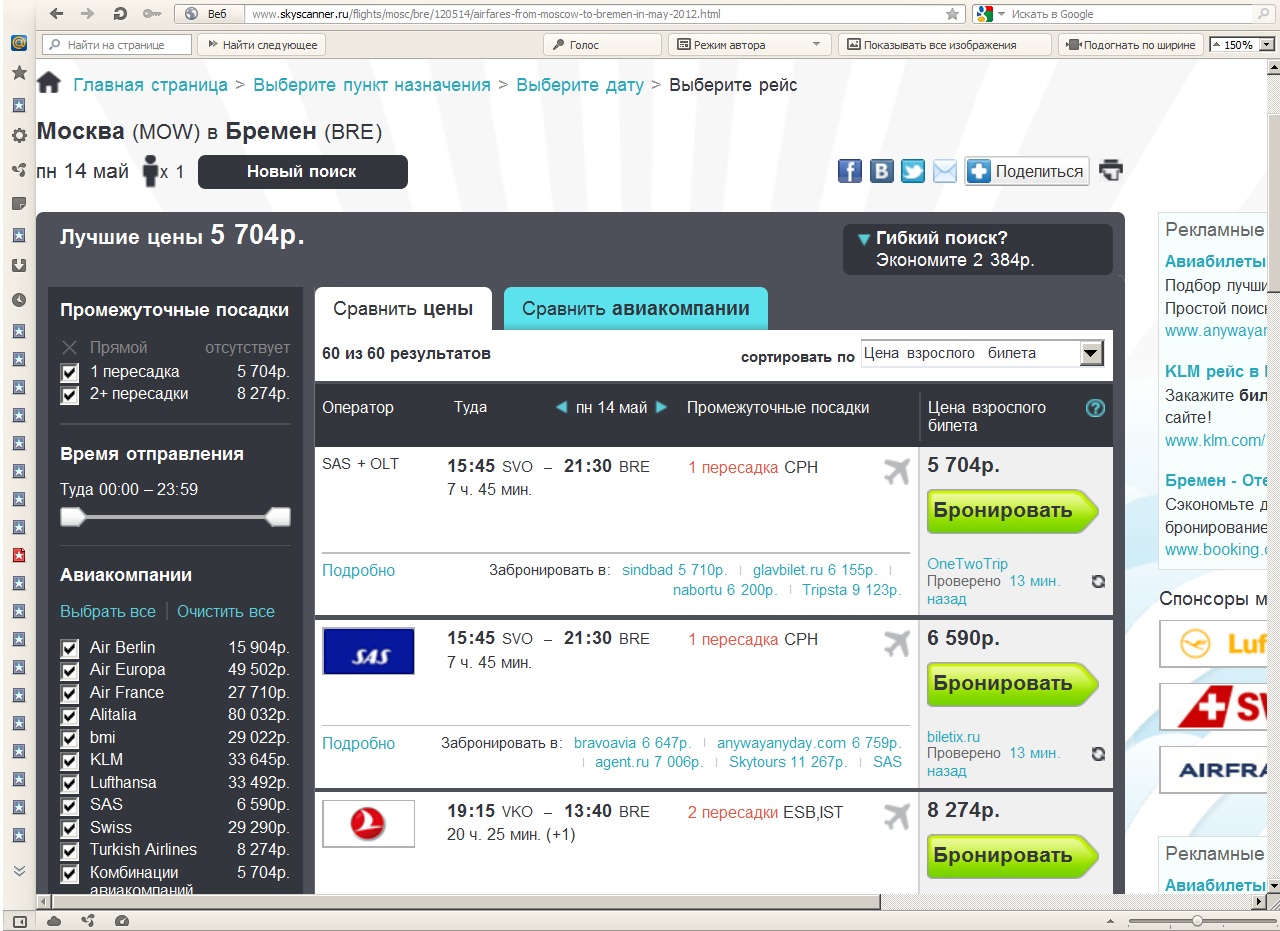 Реальные сайты - сайты авиакомпаний, а не посредников. Нууу, z.B., люфты Москва-Бремен-Москва, туда 14.05.2012, обратно 30.05.2012 выдает цену за 1 пассажира 11 659 со всеми налогами и сборами. Пересадки, естественно, в Мюнхене или Франкфурте. Просто one way - ценник не гуманный.