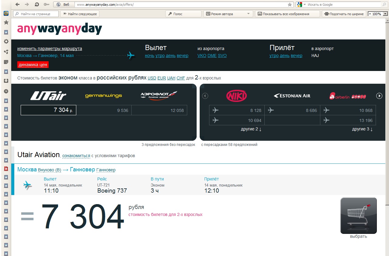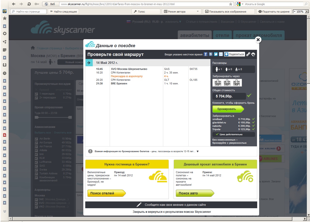 utair.ru, прямой рейс москва-ганновер, вылет 14.05 в 11-10, прилет в Ганновер в 12:10 цена 3834 (можно на сайте посредников взять, на avantix.ru например за 3700, на 130р дешевле) далее на электричке до Бремена (час ехать) - еще 18 евро (билеты на bahn.de). итого 4500рублей, и где-то в 16-00 14-го уже в Бремене. ---------- Сообщение добавлено 28.03.2012 12:58 ---------- Против 8000р (с учетом гостиницы, вечернего питания итд) если лететь через Копенгаген, и на сутки почти раньше в Бремене в итоге.