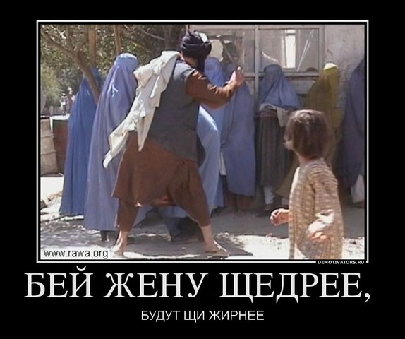 Вообще непомню уж откуда родом, но есть в исламе регламент "как бить женщину". Основной идеей оного - является символизм этого действия. Например - стукнуть зубной щеткой ее вполне допустимо.