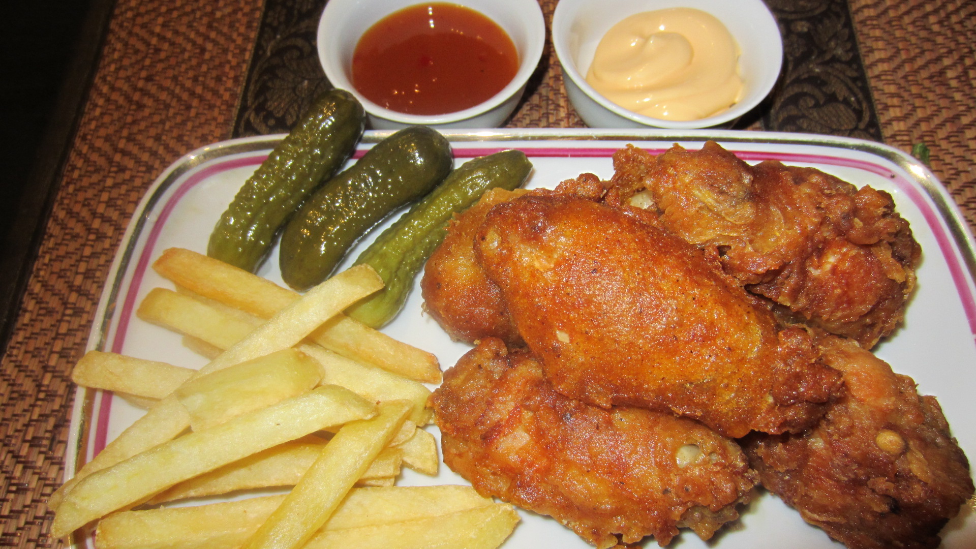 Сегодня суббота и домашний фаст-фуд на ужин. Не полезный и калорийный. но вкуусный. Муж употреблял с пивом. я с чаем. Куриные крылышки в хрустящем остром кляре. картофель фри.маринованные огурчики из соусов сырный и кисло-сладкий. За фото извиняйте. не умею я еду фоткать