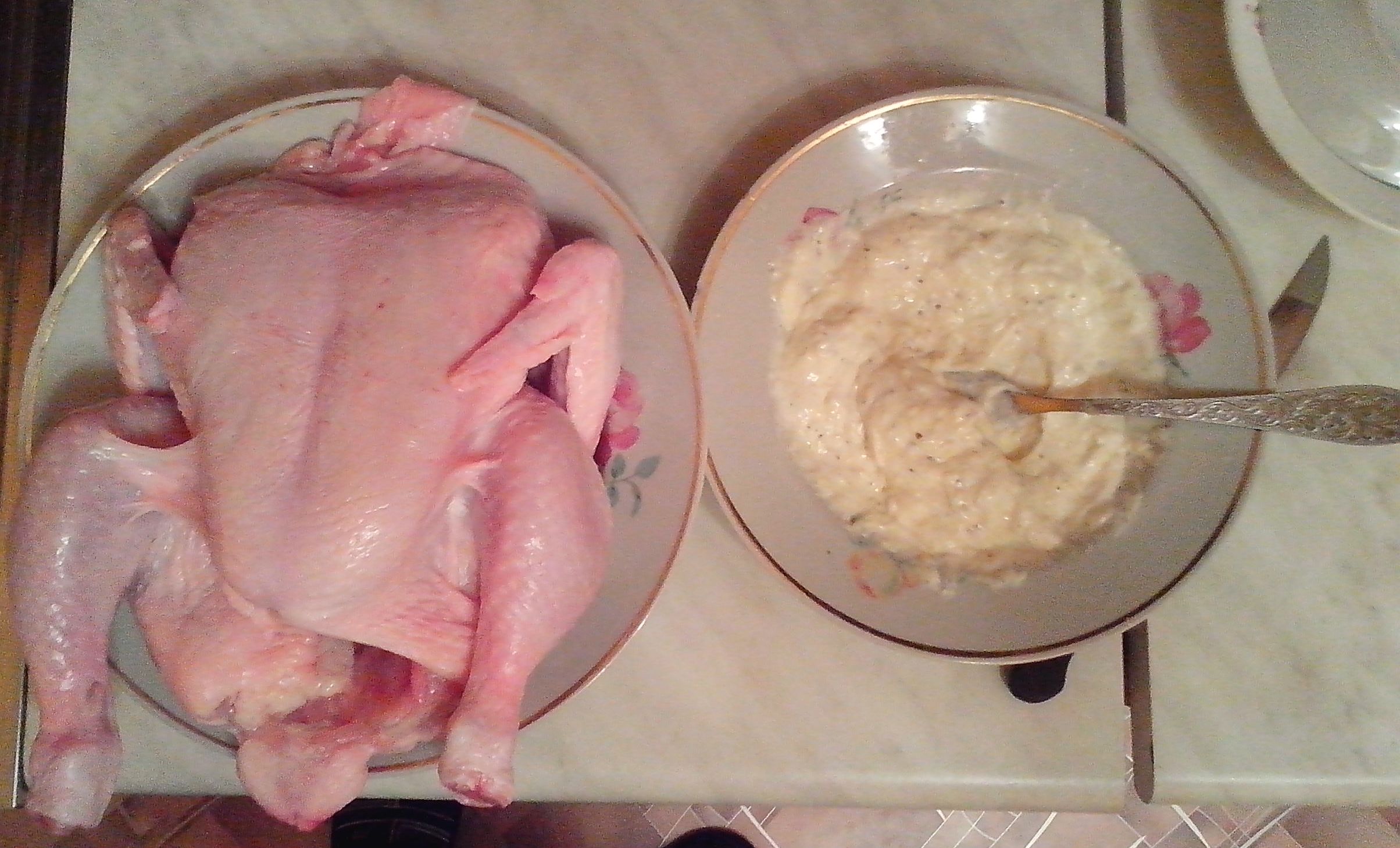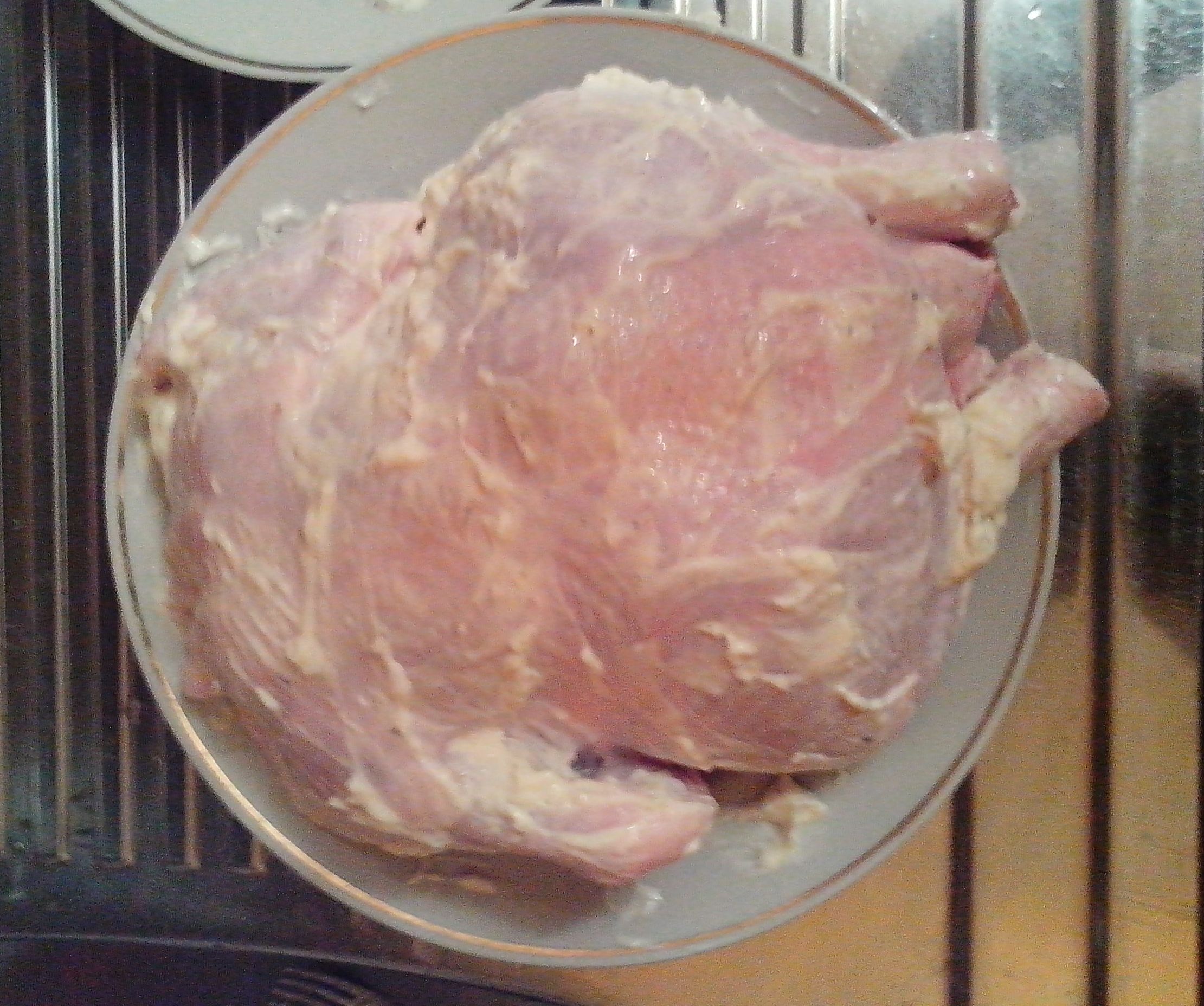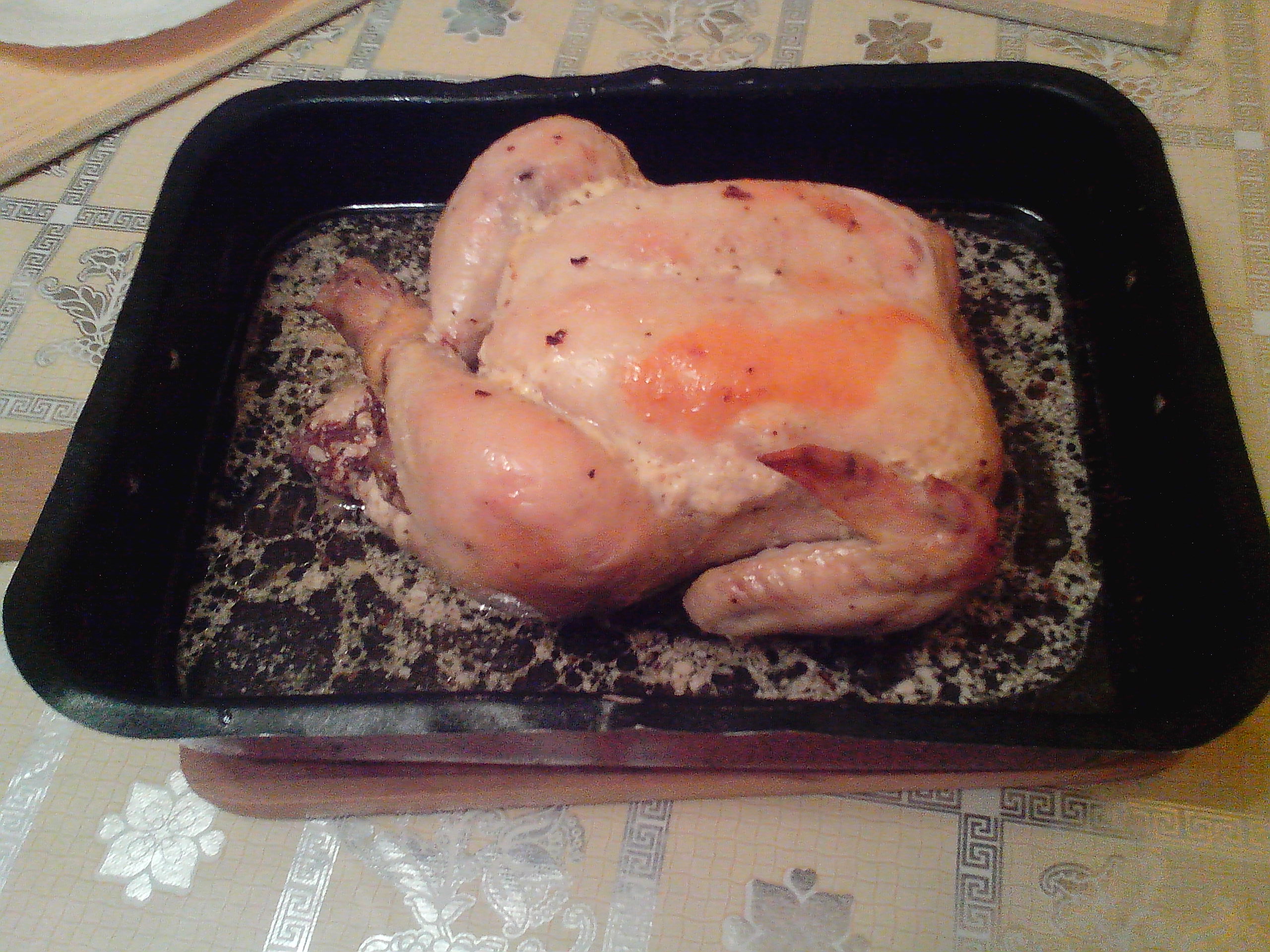 Курочку готовил сегодня. Ингридиенты - птица и обмазка. Варианты обмазки: - мёд+растительное масло+соль+специи по собственному желанию - или как сегодня - майонез, чеснок, перец, соль, сок четверти лимона. Курицу обмазать смесью внутри и снаружи, внутрь можно напихать яблоки с черносливом. Ноги завязать либо при помощи шкурки (как на фото), либо ниткой, иначе раскорячится. Положить в термопакет для запекания, выложить на невысокий противень и оставить мариноваться часа на два-три. Затем поставить в духовку при температуре 200 градусов, предварительно проколов термопакет в нескольких местах, чтобы не рвануло. Запекать примерно час, в зависимости от размера птицы. За пятнадцать минут до готовности термопакет разрезать сверху и раздвинуть в стороны для подрумянивания корочки. Перед подачей на стол остатки термопакета аккуратно удалить. Таким же образом можно готовить утку. Кстати, это в планах.