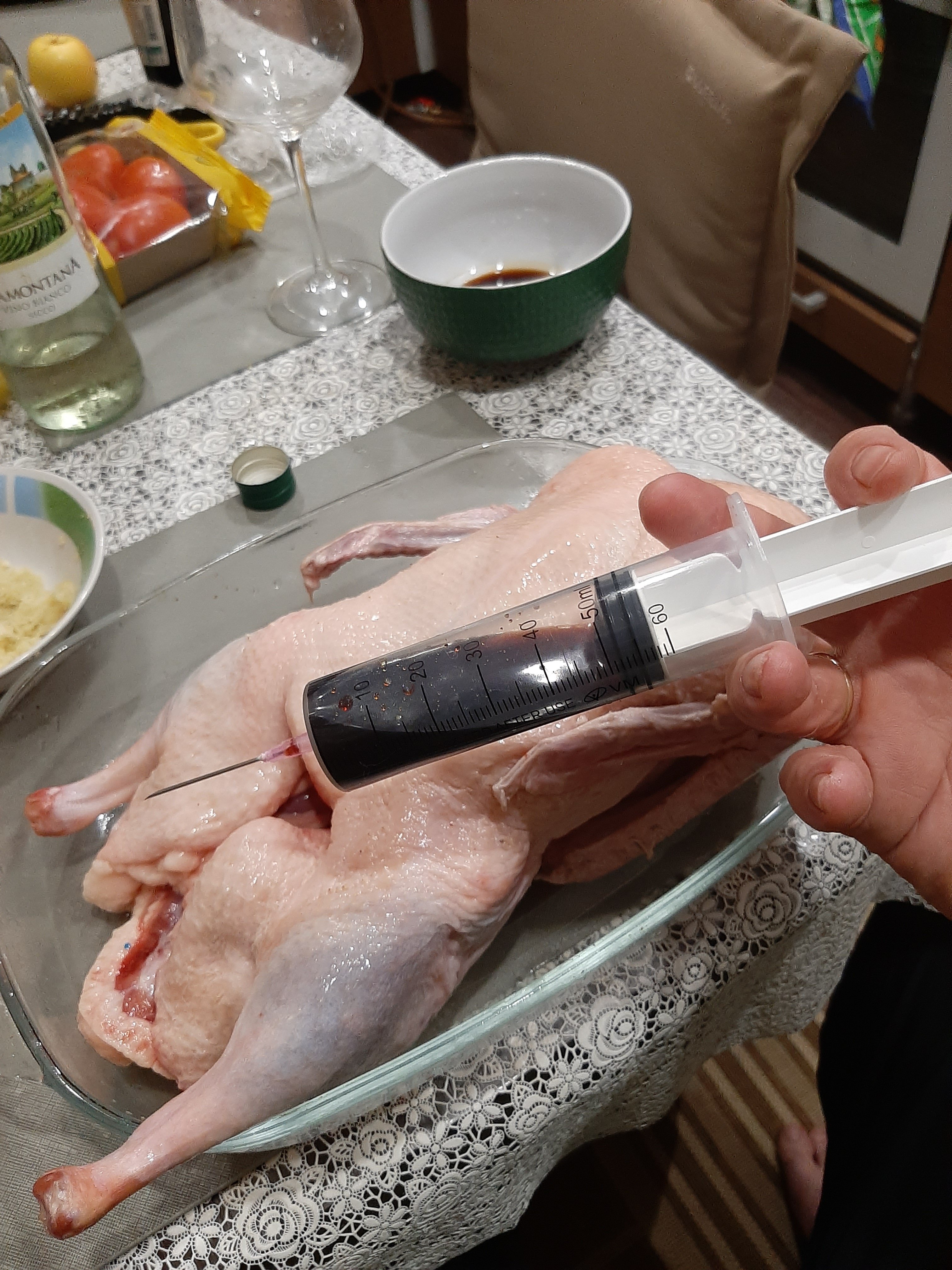Утенок, инъектированный соевым соусом, натертый солью, перцем и чесноком. В заднице яблоко с медом. Сегодня пойдет в духовку.